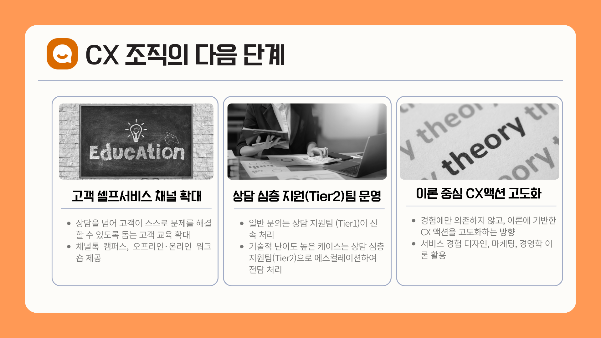 채널톡 CX팀은 CX 조직의 역할을 다음 단계로 확장하고 있다고 설명했습니다. 치열한 고민 끝에 더 나은 고객 경험을 만들기 위해 여러 시도를 해보고 있어요.