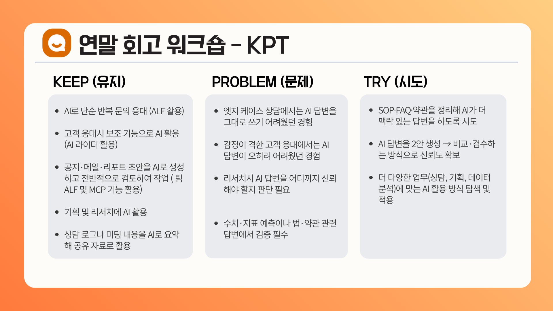 강연이 끝나고, 이어서 조별로 2025년을 돌아보는 시간을 가졌어요. 올해 AI를 활용하며 겪었던 경험을 정리하고, 각자 다음 해를 어떻게 준비하고 싶은지 생각해보는 KPT 회고 방식을 진행했습니다.