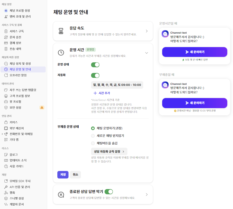 채팅상담 운영시간 설정과 함께 운영시간 외 부재중일 때 상시 채팅을 운영하실지, 새 상담을 받지 않을지, 운영시간 외에는 채팅상담 버튼을 숨길지 설정하실 수 있어요. 연휴 기간에는 평소와 다르게 기간과 시간을 설정하여 채팅 상담 운영 상태를 변경할 수 있답니다.