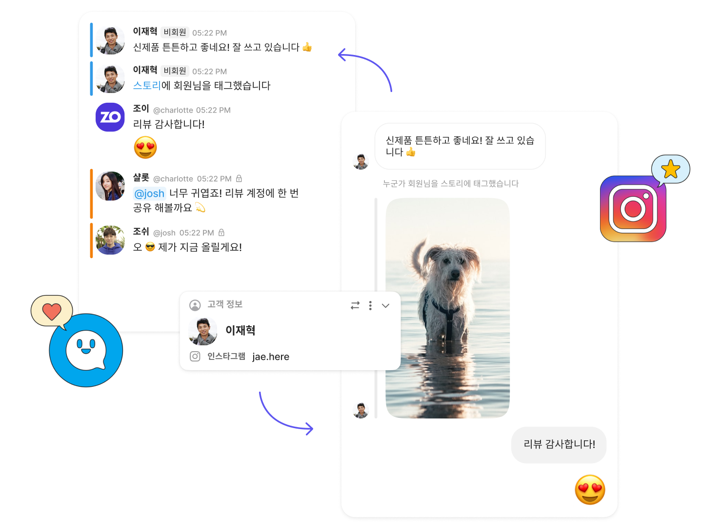 인스타그램, 카카오톡, 네이버 톡톡에서 온 문의사항을 한곳에서 관리할 수 있어요