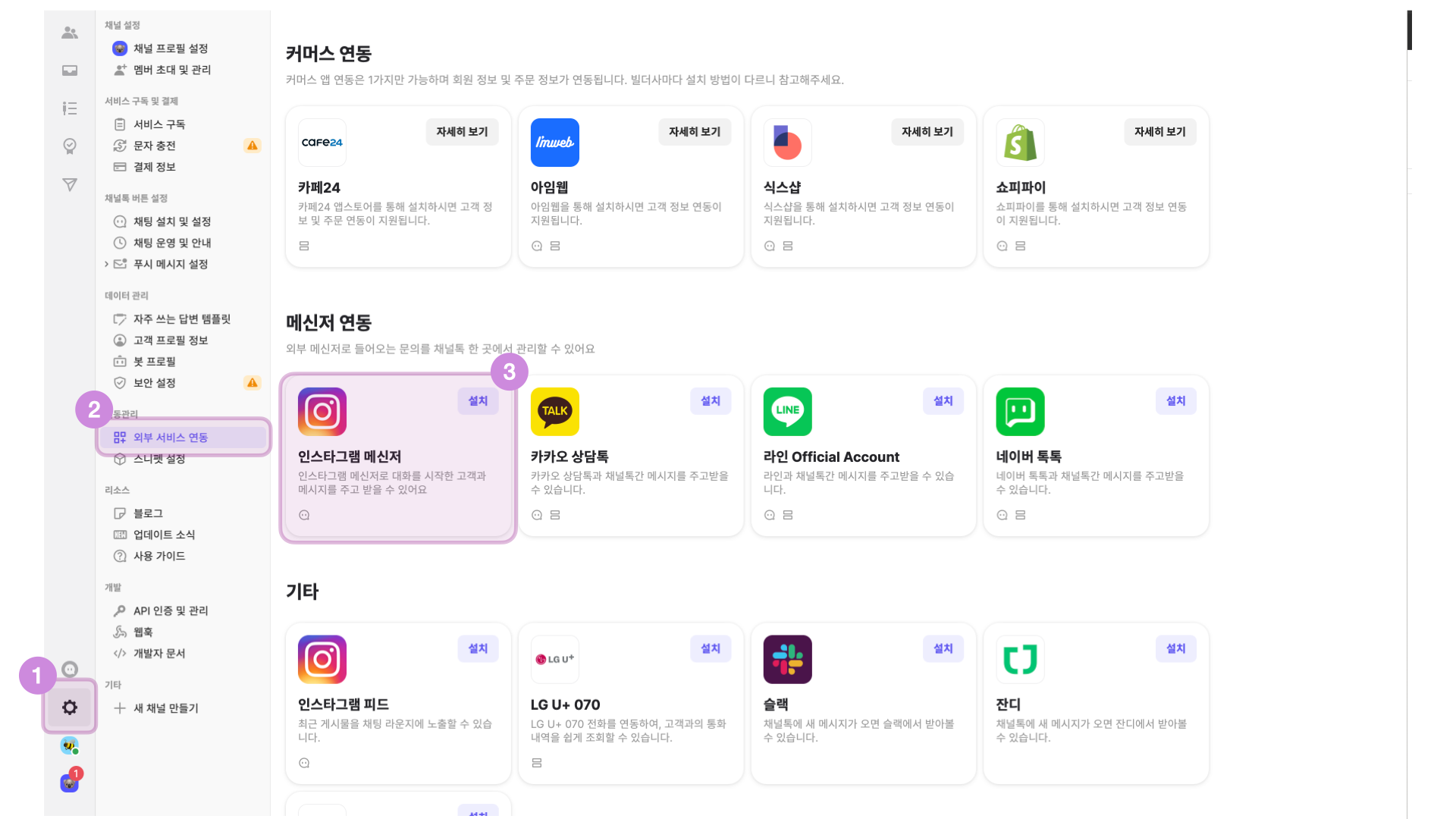 채널톡은 외부 메신저 연동을 무료로 제공하고 있어요! 간단한 정보 입력으로 카카오 상담톡*, 네이버톡톡, 그리고 인스타그램 DM으로 들어오는 메시지까지 모두 하나의 채널톡 관리 페이지에서 문의를 받고 답장할 수 있어요.