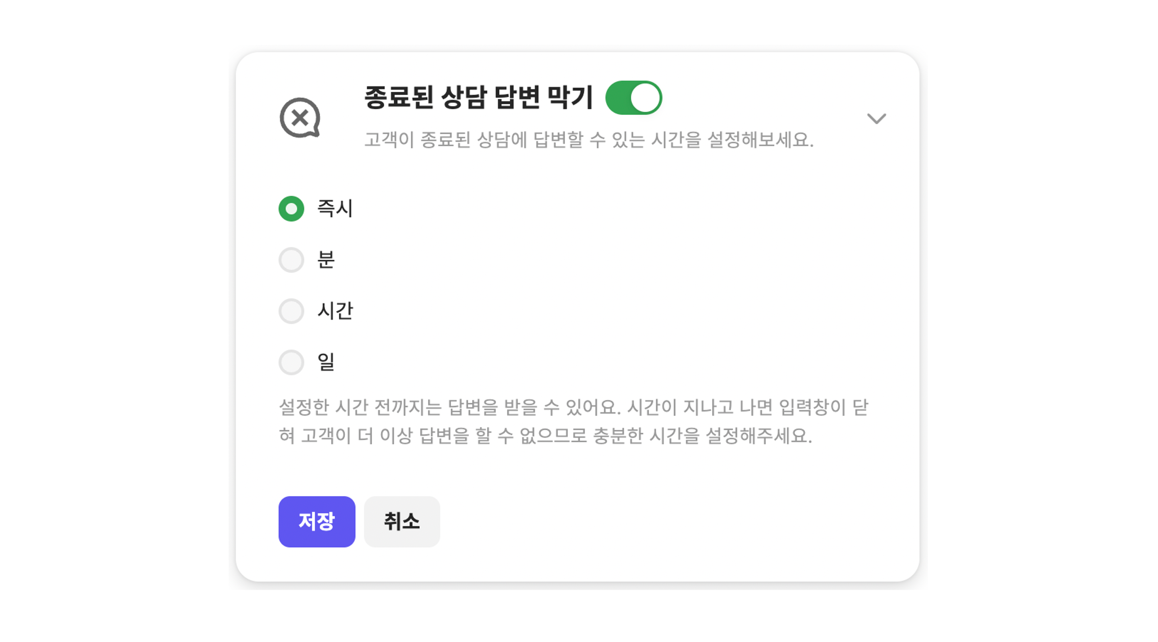 걱정하지 않아도 돼요! 고객과 대화가 중단된지 일정 시간이 지나면 채팅창을 닫아주는 '종료된 상담 답변 막기' 기능을 설정해 주세요. 최소 시간 1분으로 지정해 두시면 종료 처리한 상담 대부분은 곧 메시지 입력창이 닫히고, 다시 돌아온 고객은 새 문의하기로 새 상담을 시작할 거예요.