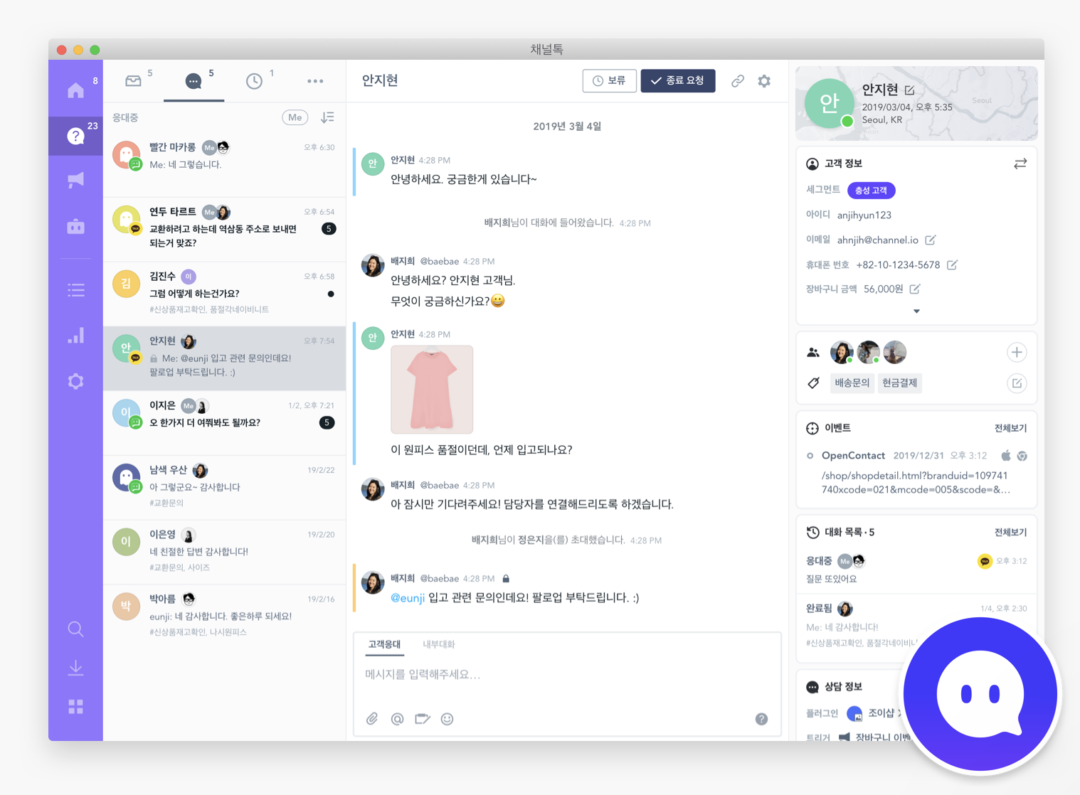 채널톡은 강력한 관리자용 앱 서비스를 제공한다. 고객이 상담을 시작하면 그 고객이 얼마나 중요한 고객인지, 과거에 어떤 대화 및 전화 내역이 오갔는지, 어떤 페이지를 보고 어떤 상품을 구매하고 질문을 남겼는지 자동으로 분석해서 함께 제공한다. 또한 상담이 끝나면 자동으로 만족·불만족 여부를 평가 받아 서비스 품질 개선에 도움을 얻을 수 있다.