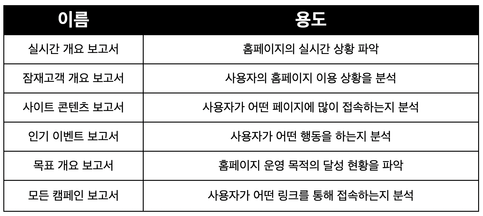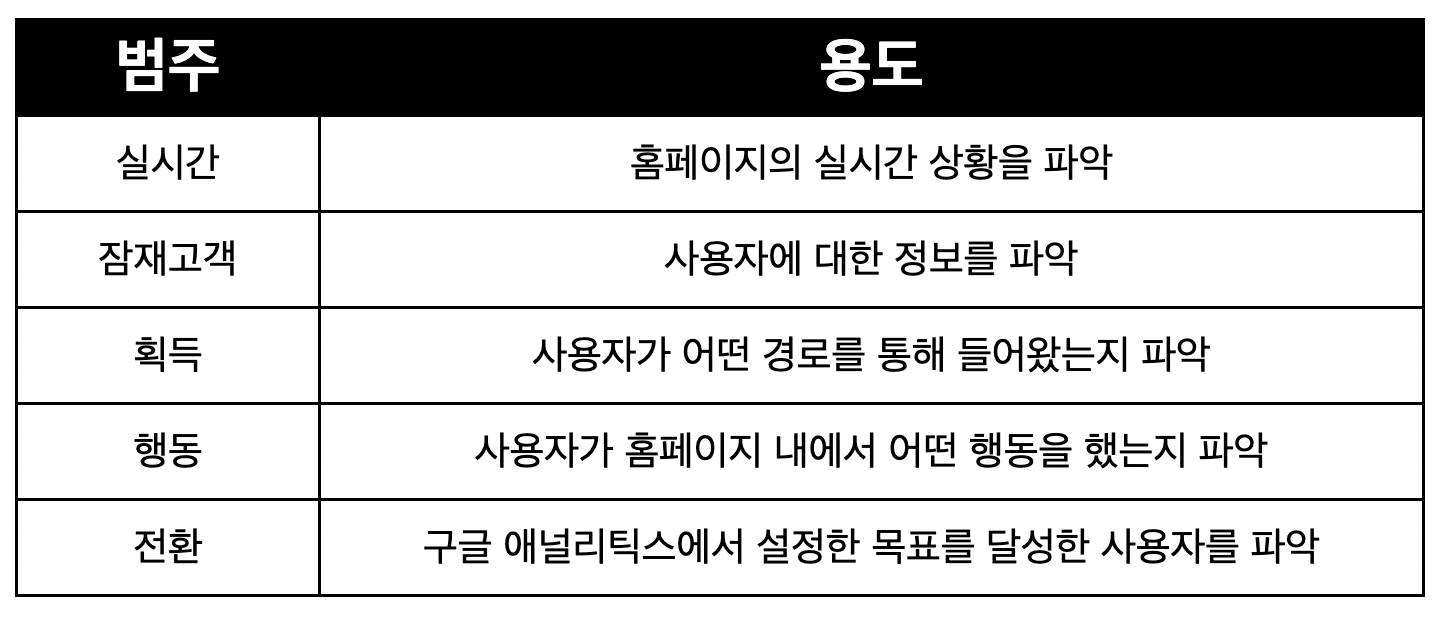 GA는 꽤 많은 형태의 보고서를 제공하고 있어요. 보고서의 큰 범주를 이해하고 있으면 자신이 확인하고자 하는 데이터에 맞춰 쉽게 보고서를 확인할 수 있어요! 아래 표에서는 GA의 보고서를 구분하는 큰 범주에 대한 내용이에요.