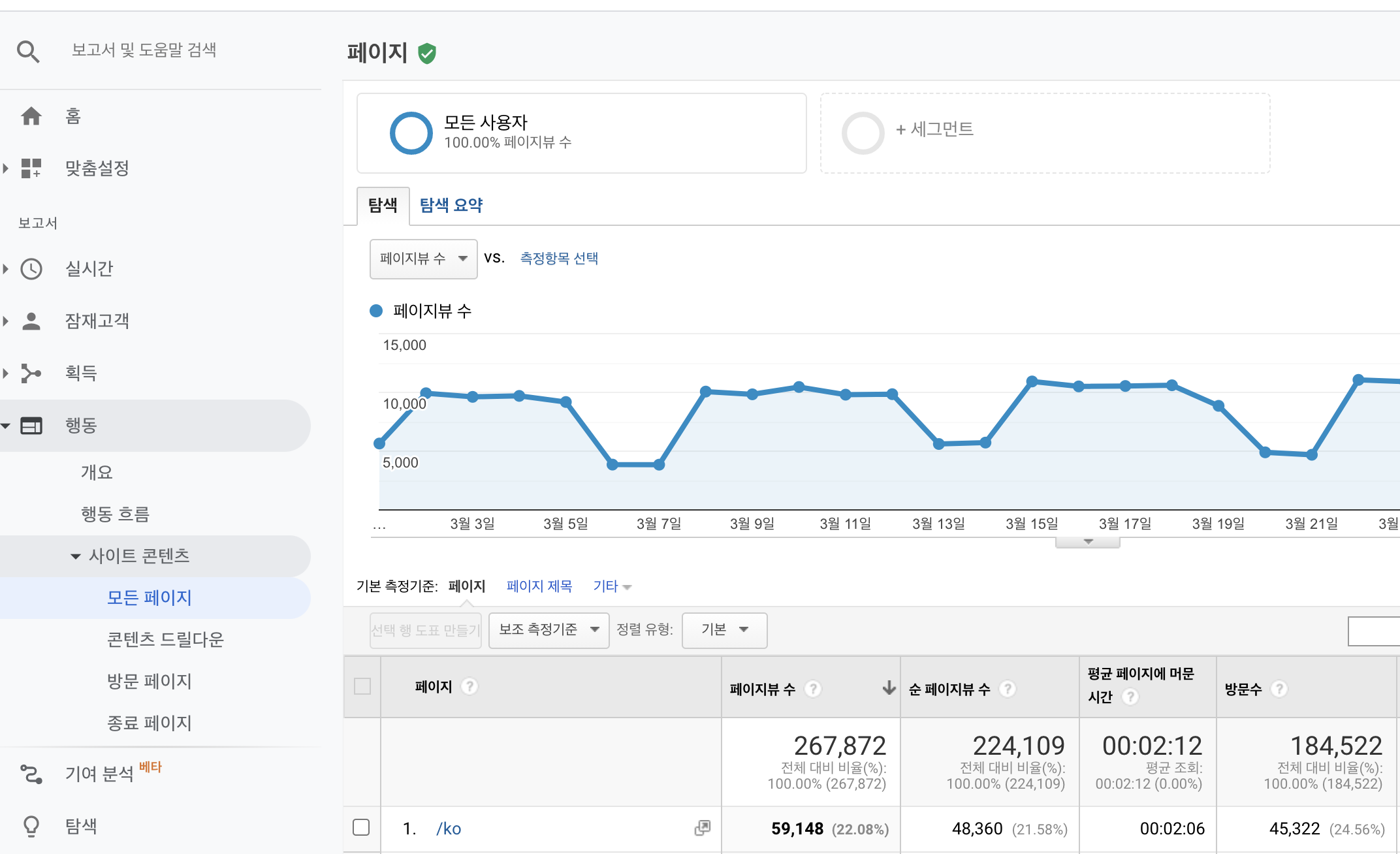 위 그림과 같이, 좌측 메뉴에서 [행동>사이트 콘텐츠>모든 페이지]를 선택하면 확인이 가능해요! 당연하게 많이 볼 수 밖에 없는 페이지들을 제외하고 분석해보세요! 좋은 인사이트를 찾을 수 있어요!