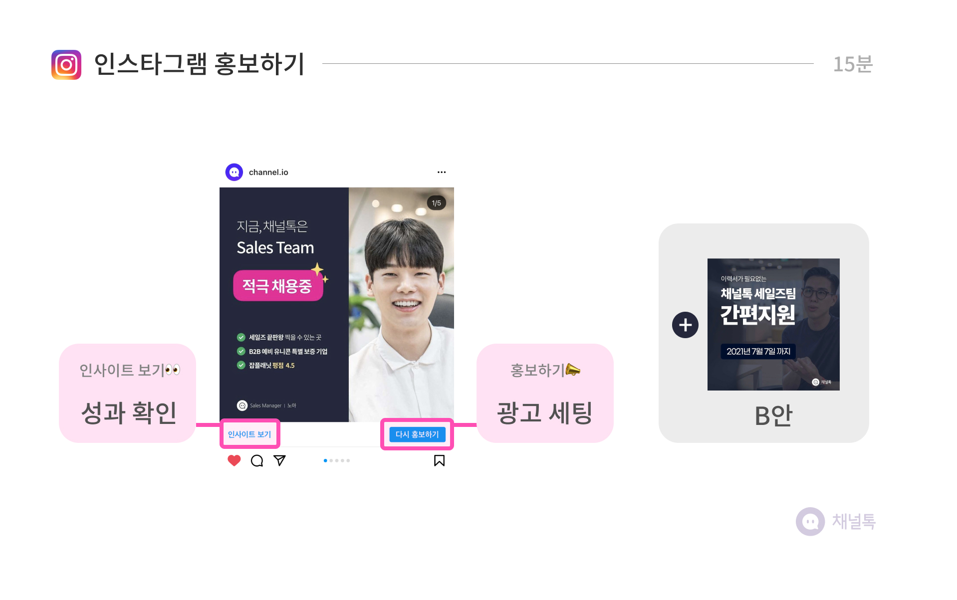 2개의 성과가 달랐던 이유를 분석해본 후에, 2위 광고를 중단하고 1위 광고에 +또 하나의 피드 홍보를 추가합니다. 1위 광고가 좋았던 이유를 반영한 이미지와 문구를 피드에 넣으면 좋아요!