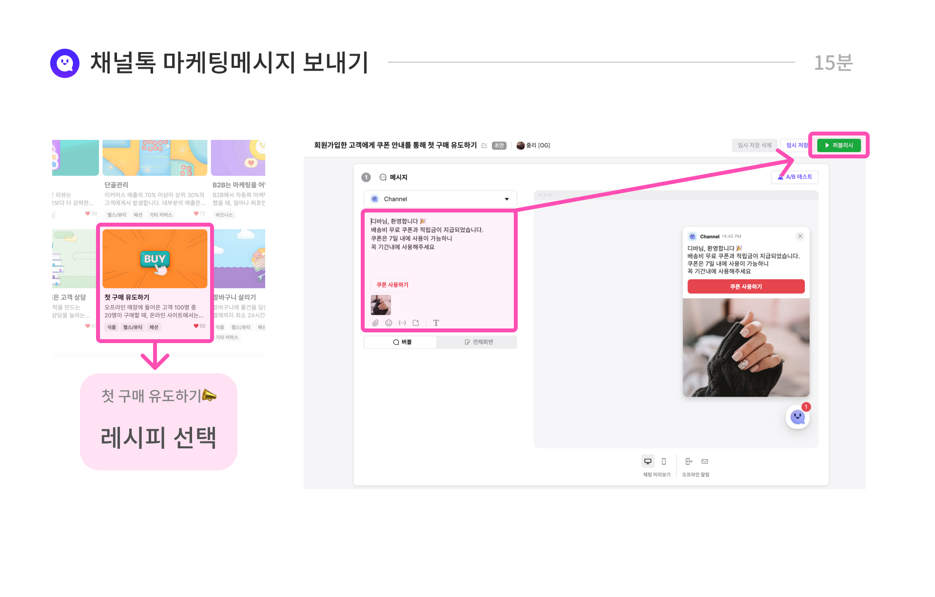 이 팝업메시지를 가장 쉽고 빠르게 설정할 수 있는 건 단연 채널톡의 마케팅레시피 기능이에요. 마케팅레시피를 활용해서 쿠폰을 제공하고 구매전환율을 높이는 팝업메시지를 5분만에 세팅해볼게요.