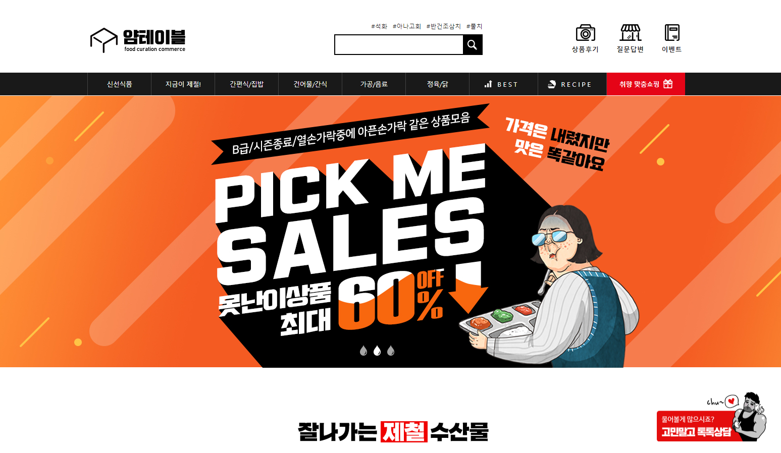 채팅 아이콘 하나만으로도 얌테이블의 브랜드 컬러가 확실하게 드러납니다. 침착하고 정적인 이미지로 신뢰를 쌓는 일반 쇼핑몰과 달리 얌테이블은 농수산물을 저렴한 가격으로 직판하는 상점 이미지를 채택하기 때문이죠. 그래서인지 전통 시장의 넉살 좋은 사장님처럼 친근하고 유머러스한 모습을 담았습니다.