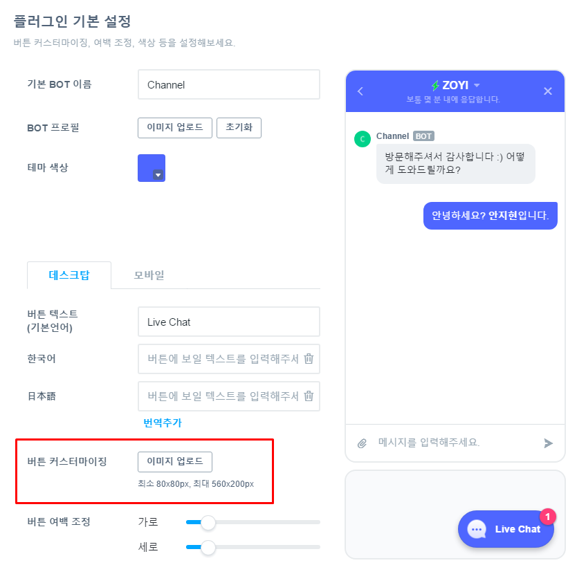 이는 별도의 커스터마이징이 아니라 채널이 기본으로 제공하는 부분입니다. 플러그인 설정의 ‘버튼 커스터마이징’에서 이미지를 최대 560 * 200px 까지 업로드 가능하기에, 이미지 자체만으로도 특별한 인상을 남길 수 있죠.