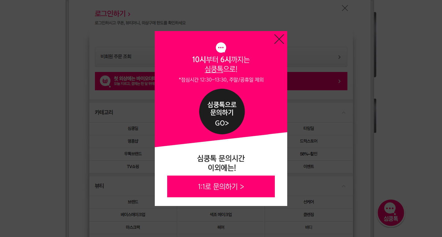 둘 다 고객의 다음 행동이 채팅 문의로 자연스럽게 이어질 법한 페이지라는 공통점이 있습니다만 이마저도 눌렀을 때 심쿵통 문의 가능 시간 외에는 게시판 형태의 전통적인 1:1 문의로 이어지도록 안내 팝업을 먼저 보여줍니다. 페르소나 마케팅을 적극적으로 활용하되 효율적으로 리소스를 관리하려는 전략이 아닐까요? 물론 특정 페이지 플러그인 노출과 팝업 역시 채널에서 커스터마이징 할 수 있는 기능입니다.