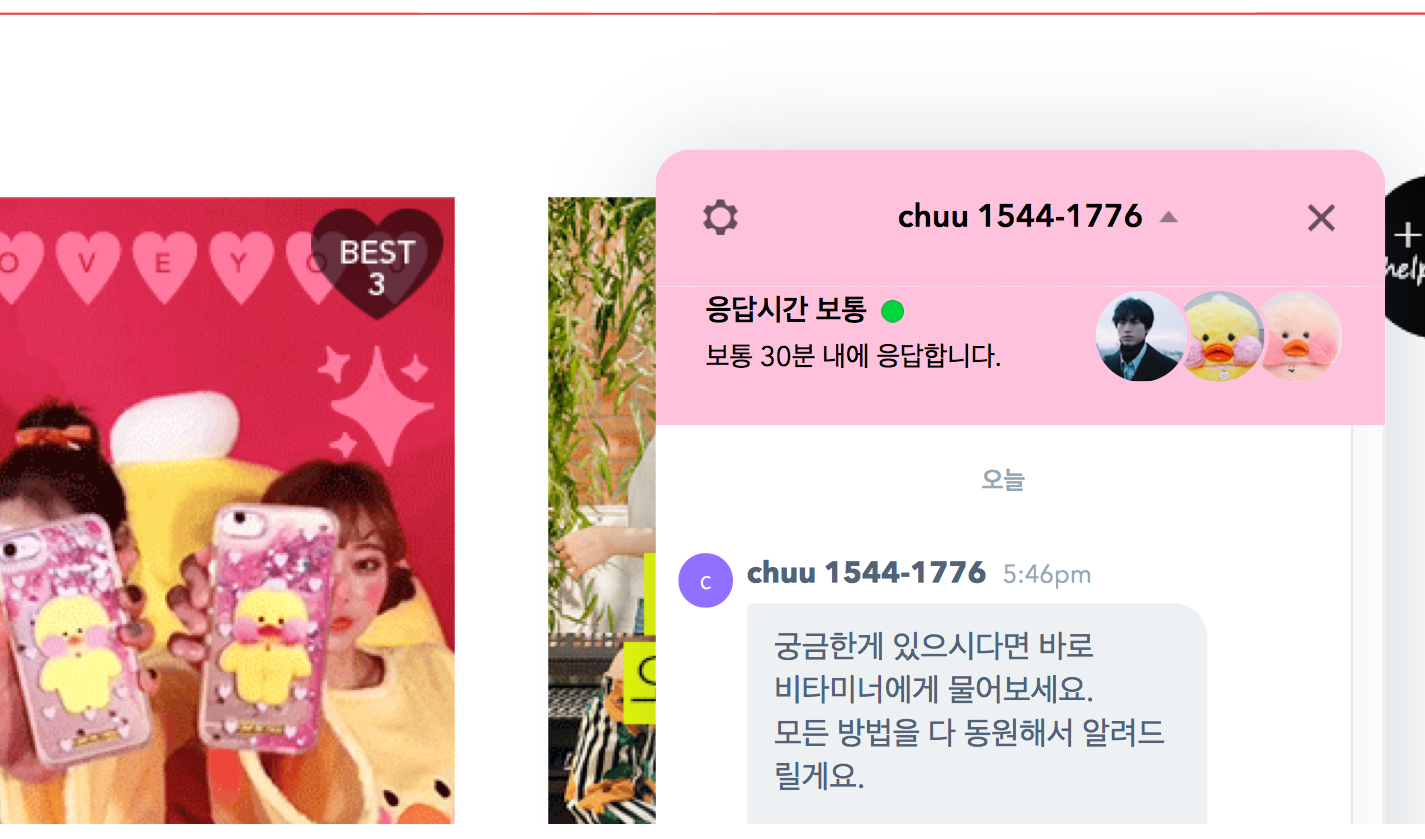 얼마 전 츄를 대표하는 빵빵덕 캐릭터 비타미너라는 페르소나가 탄생했으니까요. 가상의 캐릭터를 활용한다는 점까지는 우먼스톡과 유사한데 ‘도와줘요 비타미너❤️’라고 친근하게 쓰인 문의 버튼을 누르면 여러 명의 상담 직원 프로필이 나타난다는 차이가 있습니다. 잘 생긴 남자 직원과 빵빵덕 비타미너 캐릭터들이죠.