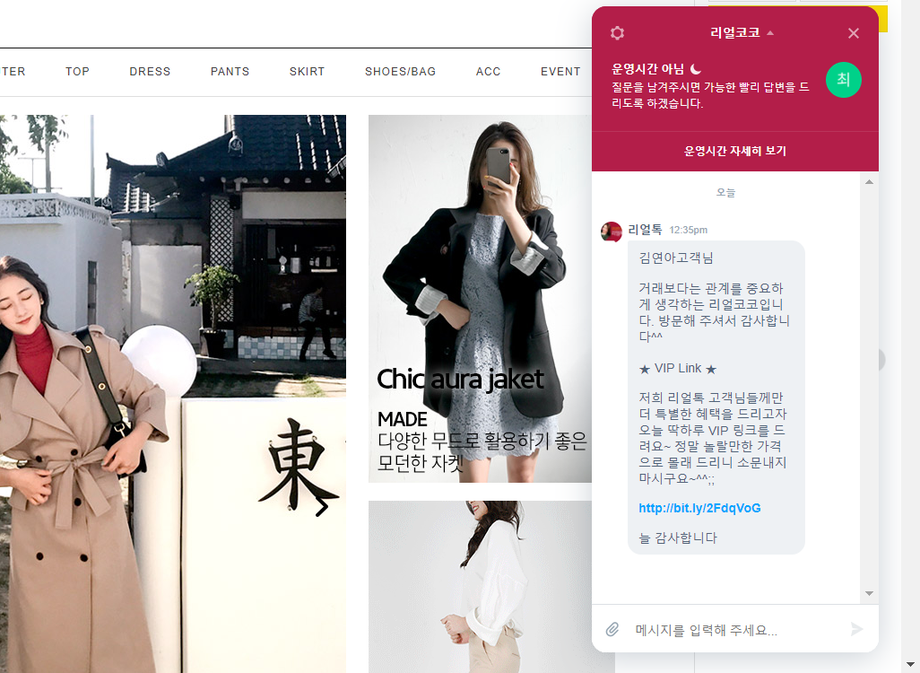 평소에는 ‘궁금한건 리얼톡’이라는 문구로 쇼핑몰 모델 자체의 페르소나를 입혀 문의를 받습니다. 모델은 쇼핑몰의 얼굴이기도 하죠. 고객에게는 모델과 직접 대화하는 컨셉이 더욱 직관적으로 다가올 것입니다. 상품 관련 문의라면 특히 그렇죠. 또한, 쇼핑몰 이름을 딴 ‘리얼톡’은 매우 명료하며 브랜드와의 연관성이 잘 드러납니다. 호기심을 자아내서 더 눌러보고 싶게 만들죠.