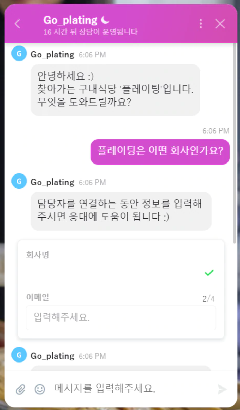 출장 구내식당 스타트업 플레이팅 홈페이지에서 채널톡을 이용해 상담하는 모습 /플레이팅 홈페이지 캡처