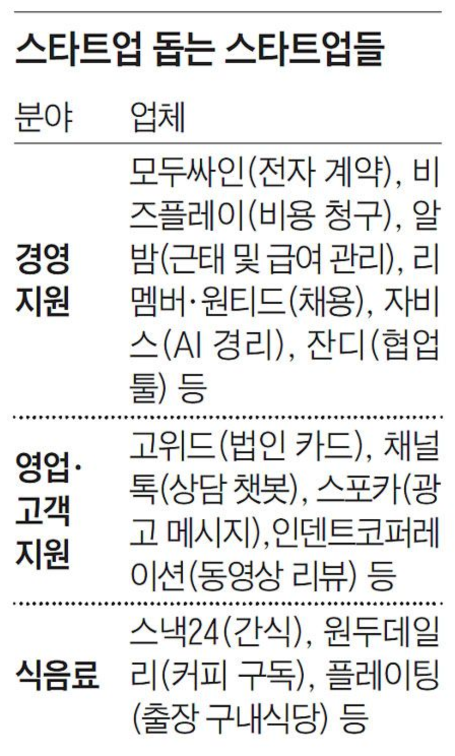 직원 40명인 코딩 교육 스타트업 코드스테이츠는 경영 관리 직원이 둘뿐이다. 그래도 문제 없이 회사가 돌아간다. 고객 문의, 전자 계약, 세무 관리 등을 전부 다른 스타트업 서비스를 이용해 처리한다. 이런 식이다. 거래처와의 계약은 모두싸인을 이용한다. 문서 업로드부터 서명 요청, 체결 완료까지 전자 문서화해서 5분이면 계약을 완료할 수 있는 것이 장점이다. 김인기 코드스테이츠 대표는 “이런 업무를 우리가 개발하고 직접 처리해야 했다면 수많은 시간과 돈, 인력이 낭비됐을 것”이라고 했다. 영수증과 급여 관리는 AI(인공지능) 경리 프로그램인 자비스 몫이다. 스타트업 자비스앤빌런즈가 운영하는 자비스는 홈택스, 법인카드 등 회사의 모든 금융 정보를 한 번에 관리하고 급여를 자동 계산해준다. 전용 앱으로 영수증 처리 등도 해결한다.