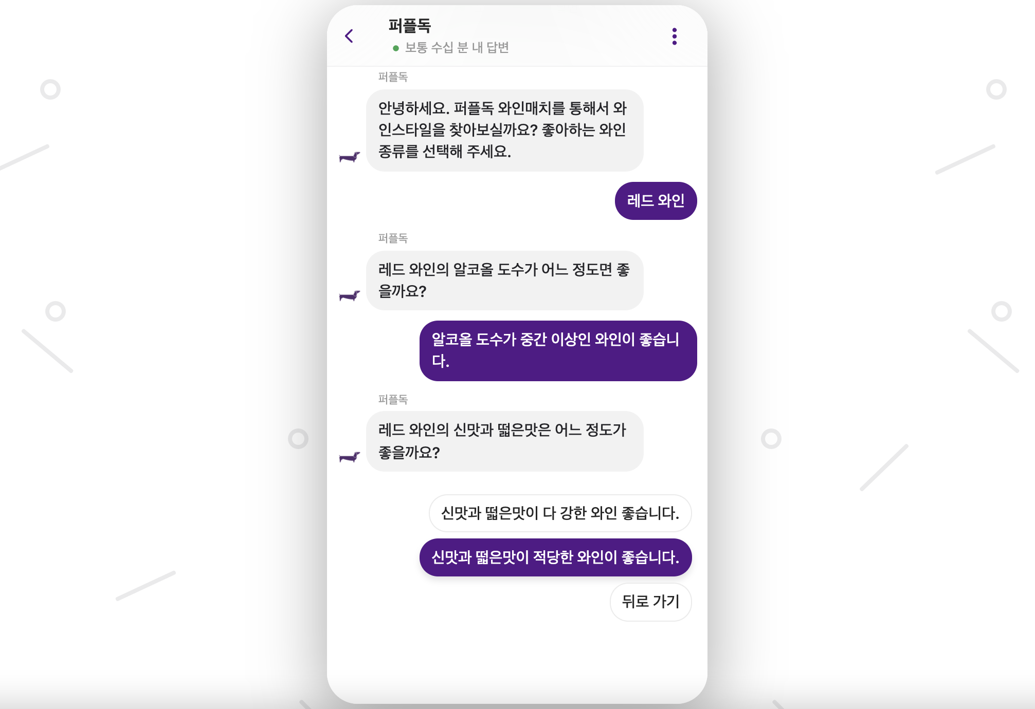기업 소개 : 퍼플독은 와인 구독 서비스예요. 퍼플독을 3개월 구독하면 나의 와인 취향을 알게 되고, 6개월 구독하면 나만의 소울 와인을 찾을 수 있게 된다고 해요.