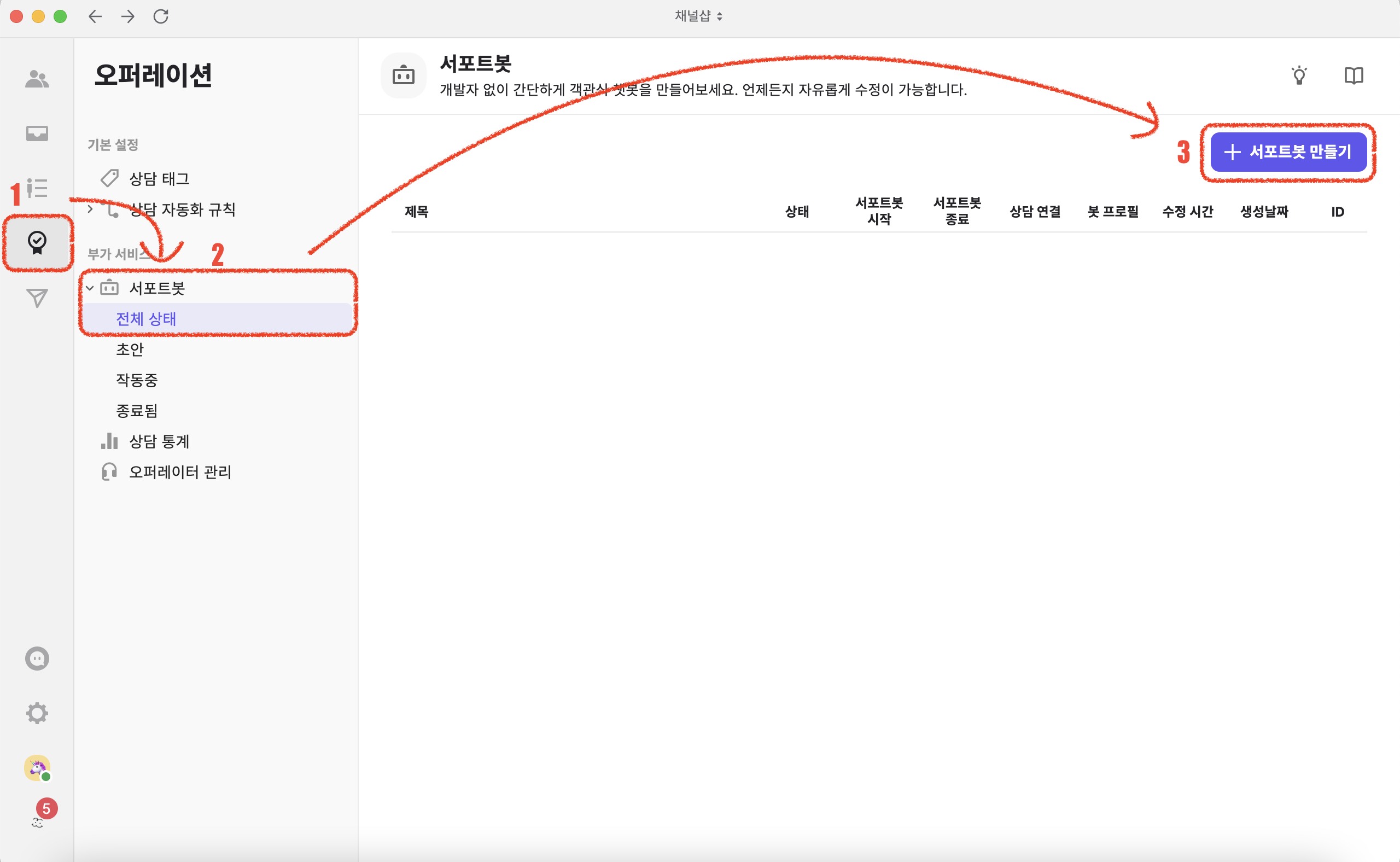 채널톡에 접속하면 하단과 같은 화면이 보이실 거예요. ❶오퍼레이션 > ❷서포트봇 > ❸서포트봇 만들기 버튼을 클릭해주세요.