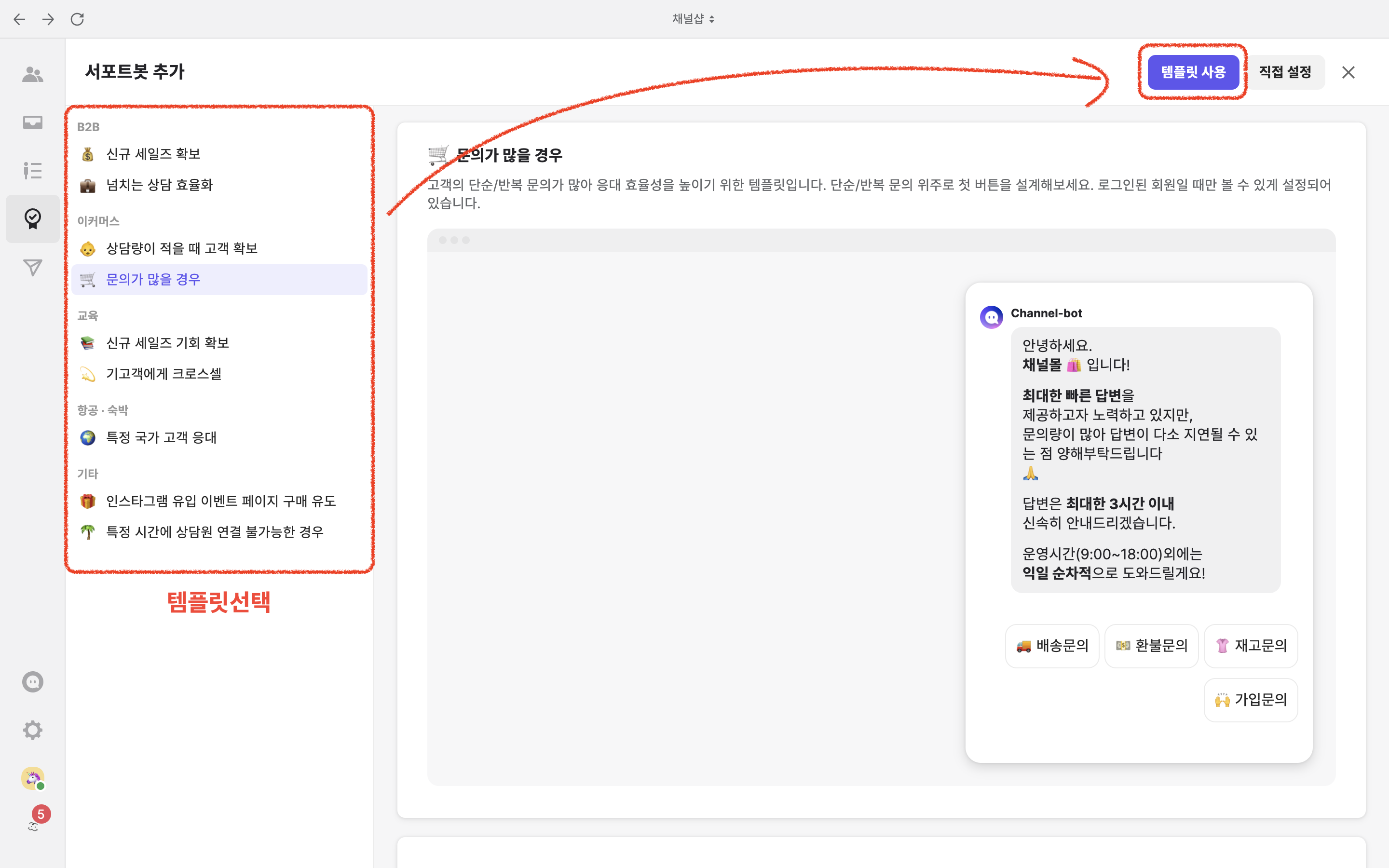 원하는 템플릿을 선택해주세요. 저는 이커머스의 '문의가 많을 경우' 템플릿을 선택할게요.