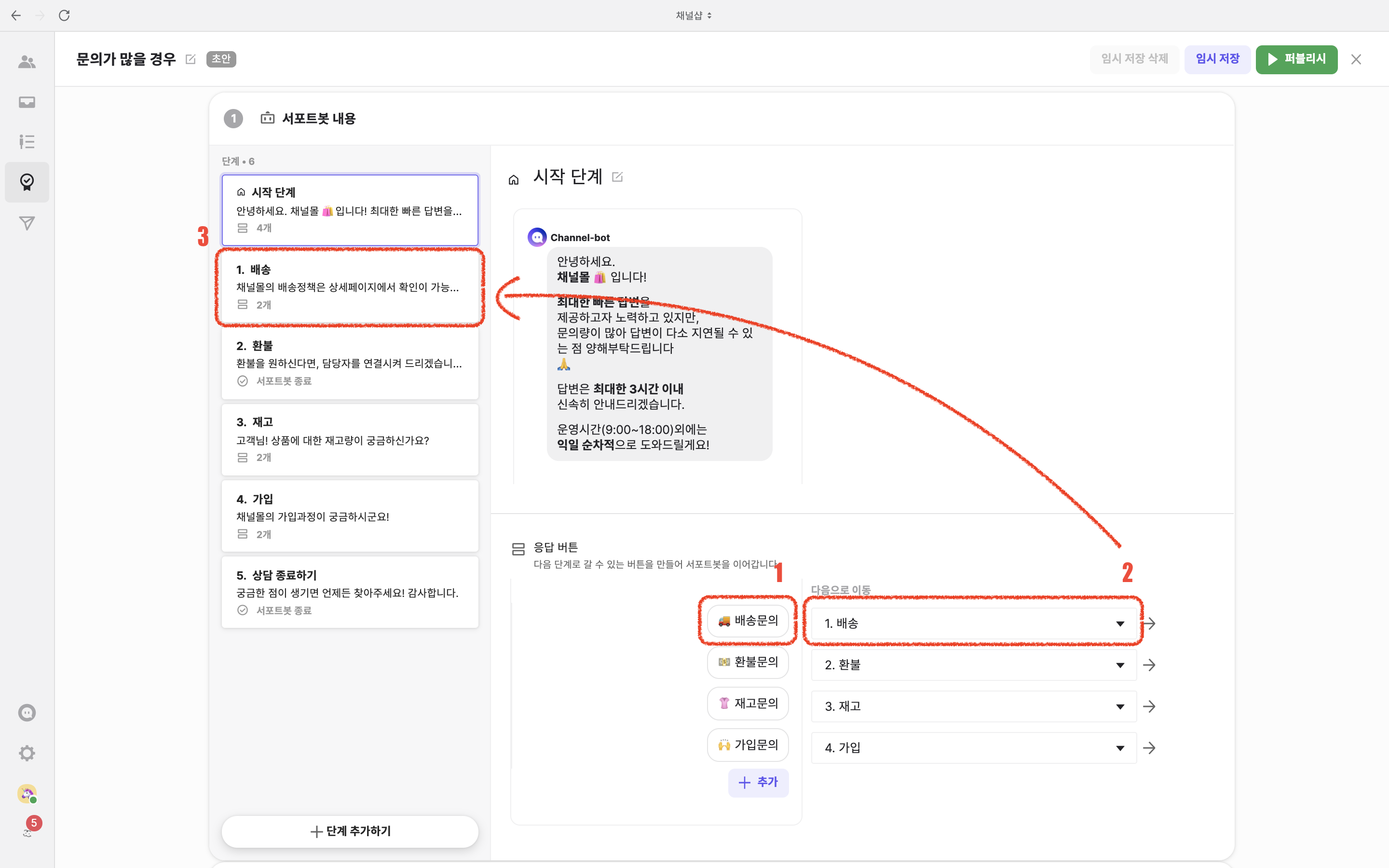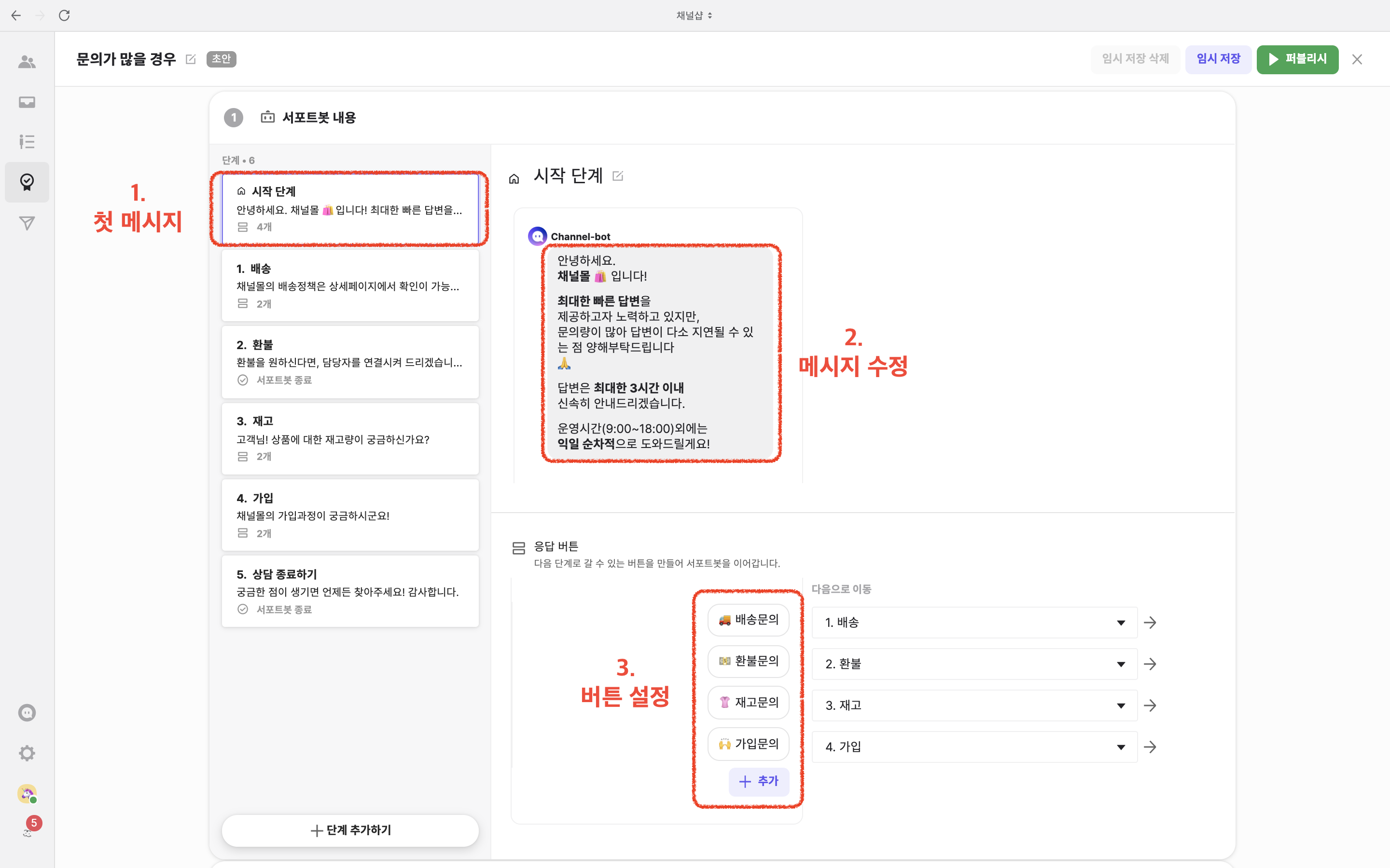 ❸번 영역에는 고객이 클릭할 버튼명을 입력해주세요. 예를들어 교환/반품, 배송 문의, 제품 문의, 상품 추천과 같은 항목을 입력하면 되겠죠.