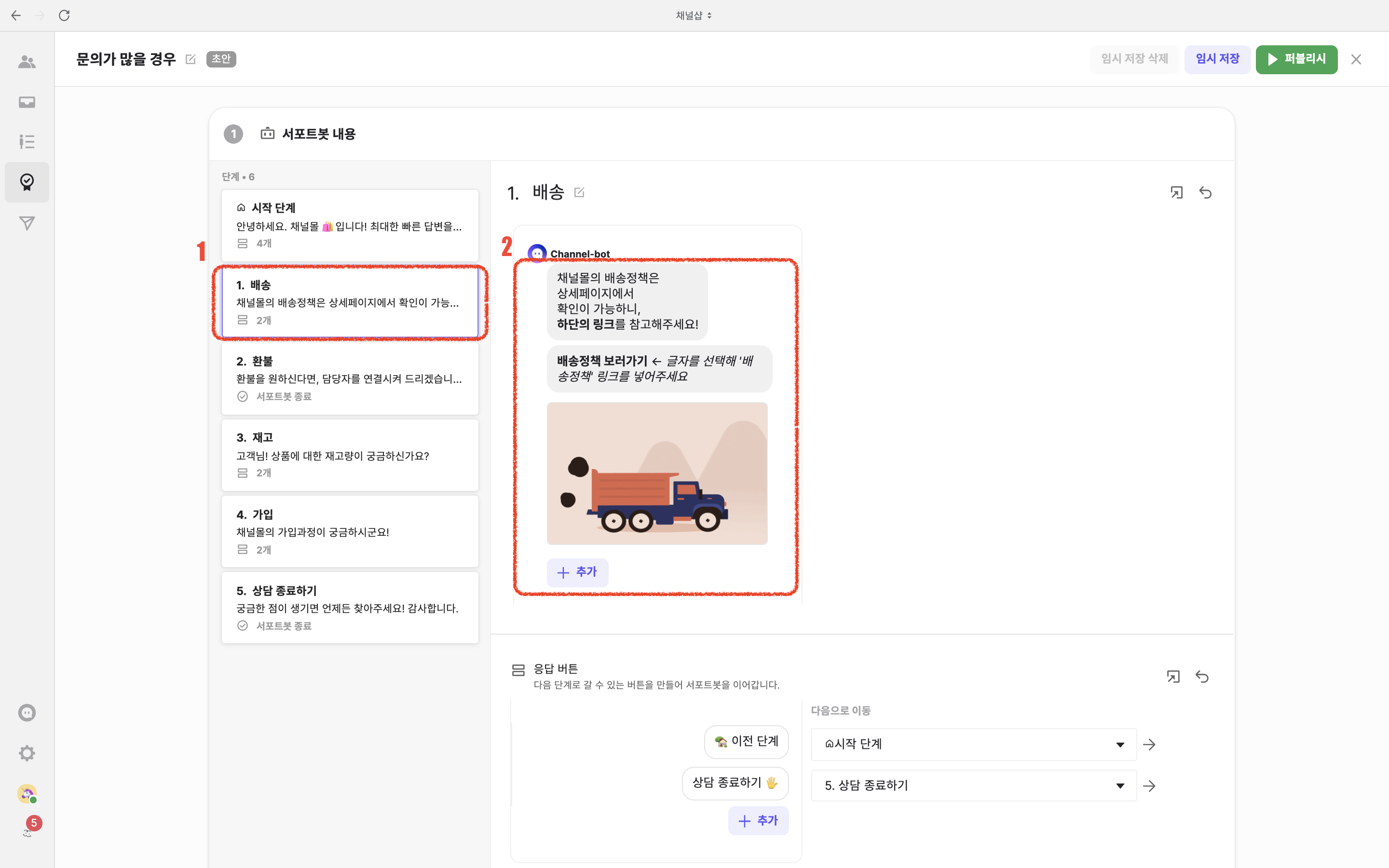 ❷답변을 입력할 수 있는 화면이 나와요. 예를들어 고객이 배송 문의 아이콘을 클릭하면 "배송은 일반적으로 2-3일 내에 완료됩니다"와 같은 답변을 이곳에 입력하시면 되겠죠.