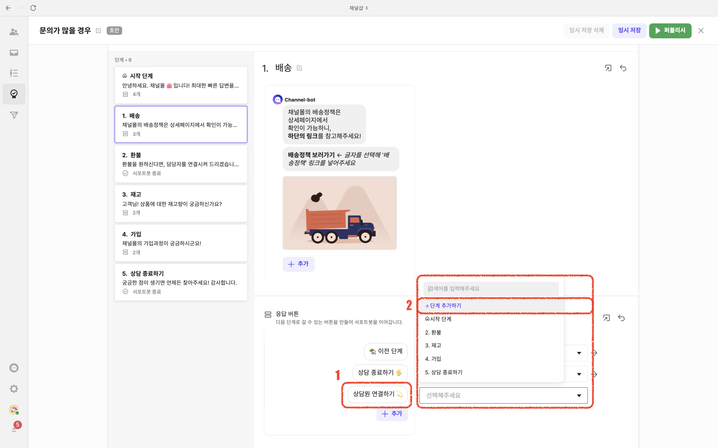 ❶상담원 연결하기 버튼을 만들고, ❷단계 추가하기를 클릭해주세요