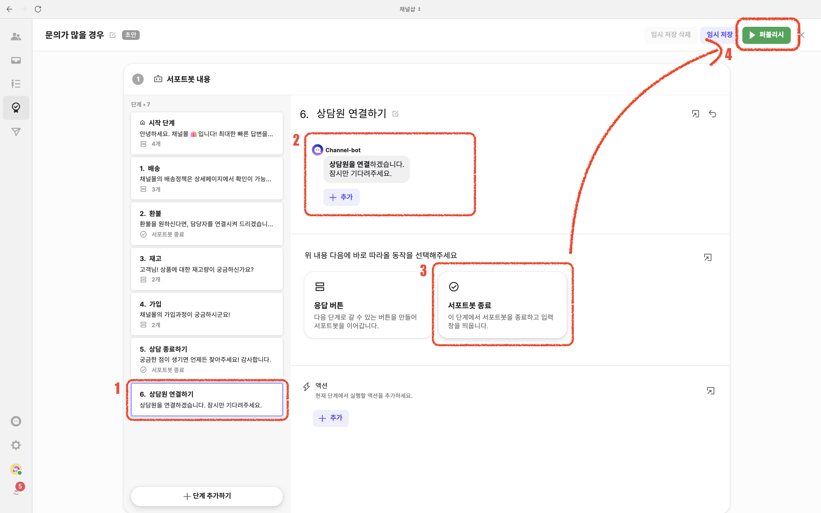 ❹퍼블리시 버튼을 누르면 서포트봇 제작이 완료됩니다!