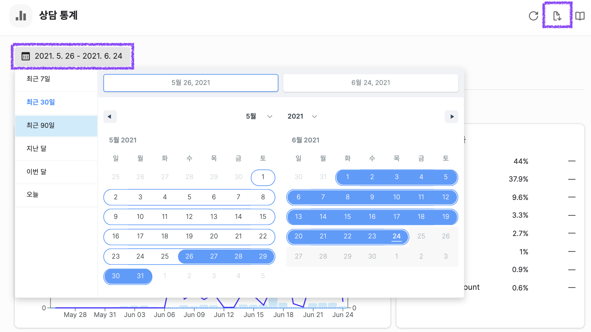 날짜를 선택하면, 지정된 날짜의 통계 대시보드를 바로 확인할 수 있어요. 우측 상단의 데이터 다운로드 버튼을 클릭하면, 선택한 날짜의 통계를 엑셀로 다운받을 수 있어요.