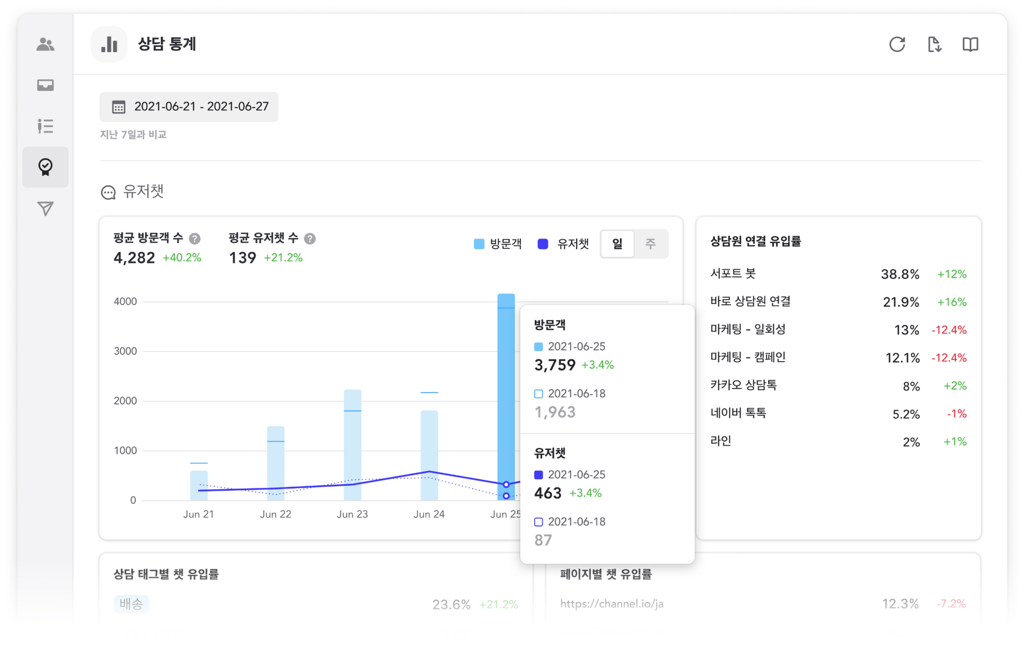 평균 방문객 수 - 순 방문자(Unique Visitors, UV) 기준이에요. 평균 유저챗 수 - 유저챗 수는 상담이 시작된 시간을 기준으로 해요. 만약 종료된 상담이 다시 시작된 경우, 새로 시작된 시간을 기준으로 측정해요. 한 명의 고객이 새 유저챗 열기로 여러 번 연 경우에는 각각의 상담으로 판별하여 개별 수치로 합산됩니다.