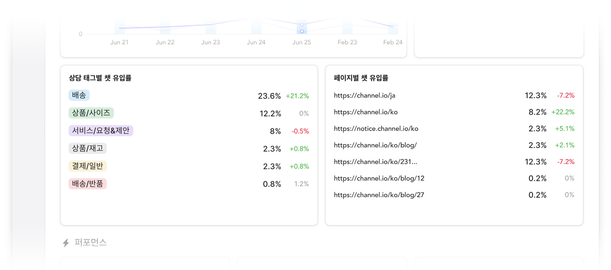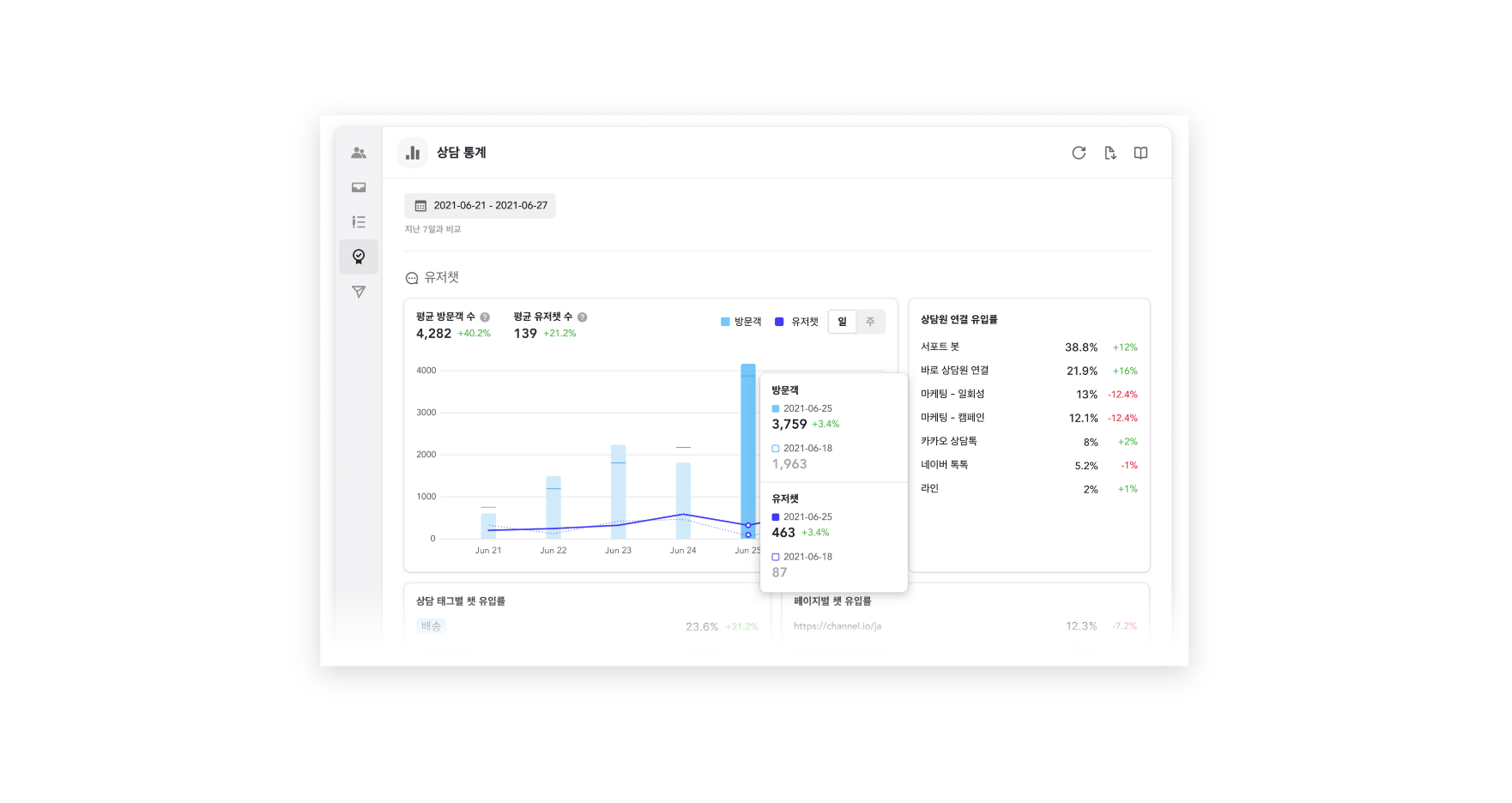 상담원 연결 유입률을 통해 상담으로 연결된 채팅이 어디에서 유입되는지 알 수 있어요.