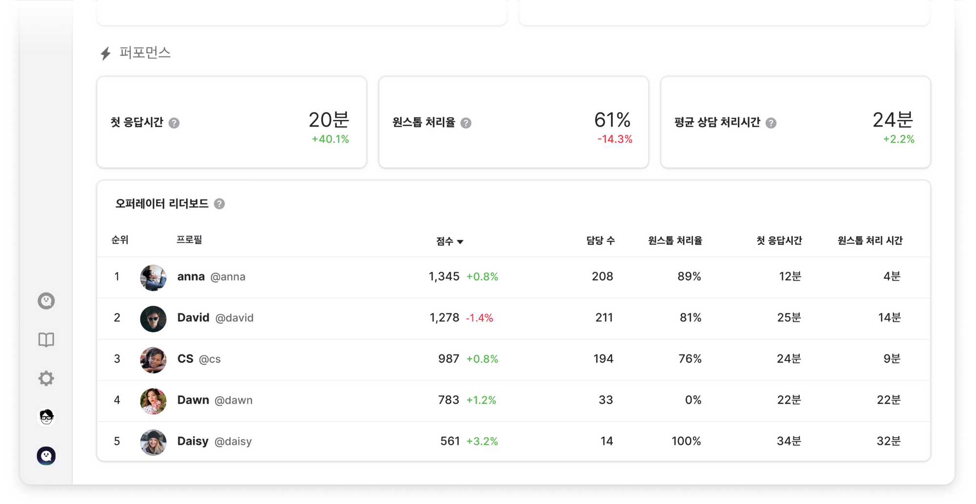 오퍼레이터 리더보드는, 선택한 기간동안 고객과 상담을 진행한 오퍼레이터(매니저)들의 순위를 보여줍니다. 리더보드의 점수는 여러가지 지표를 바탕으로 계산됩니다. 담당자로 참여한 상담이 많을수록, 원스톱 처리율이 높을수록 가중치를 얻어요. 퍼포먼스의 첫 응답시간과 원스톱 처리율은 동일한 지표로 이해하시면 돼요. 다만 퍼포먼스 쪽의 메인 지표들은 전체적인 지표들이고, 오퍼레이터 리더보드는 각 오퍼레이터의 지표로 이해하시면 돼요.