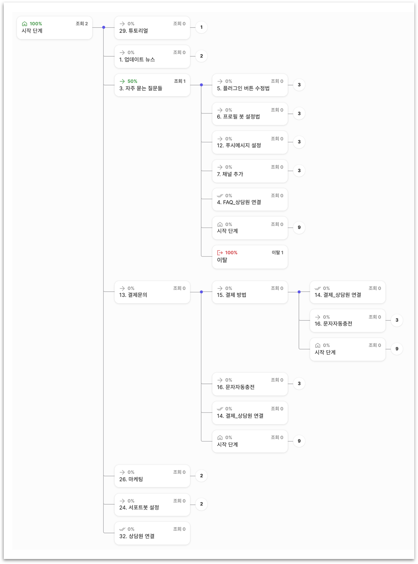 자주 들어오는 문의를 분류한 후 해당 내용을 서포트봇의 상위 단계에 위치시켜보세요. 고객이 빠르게 답변을 확인하여 문제 해결하는데 도움을 줄 수 있습니다. 만약 서포트봇에 담기엔 내용이 길거나 어려운 내용이라면 사용 가이드로 작성해보세요. 변경 후 해당 태그의 문의량이 얼마나 감소되었는지 비교하셔서 상담 효율화의 성과를 측정하실 수 있습니다.