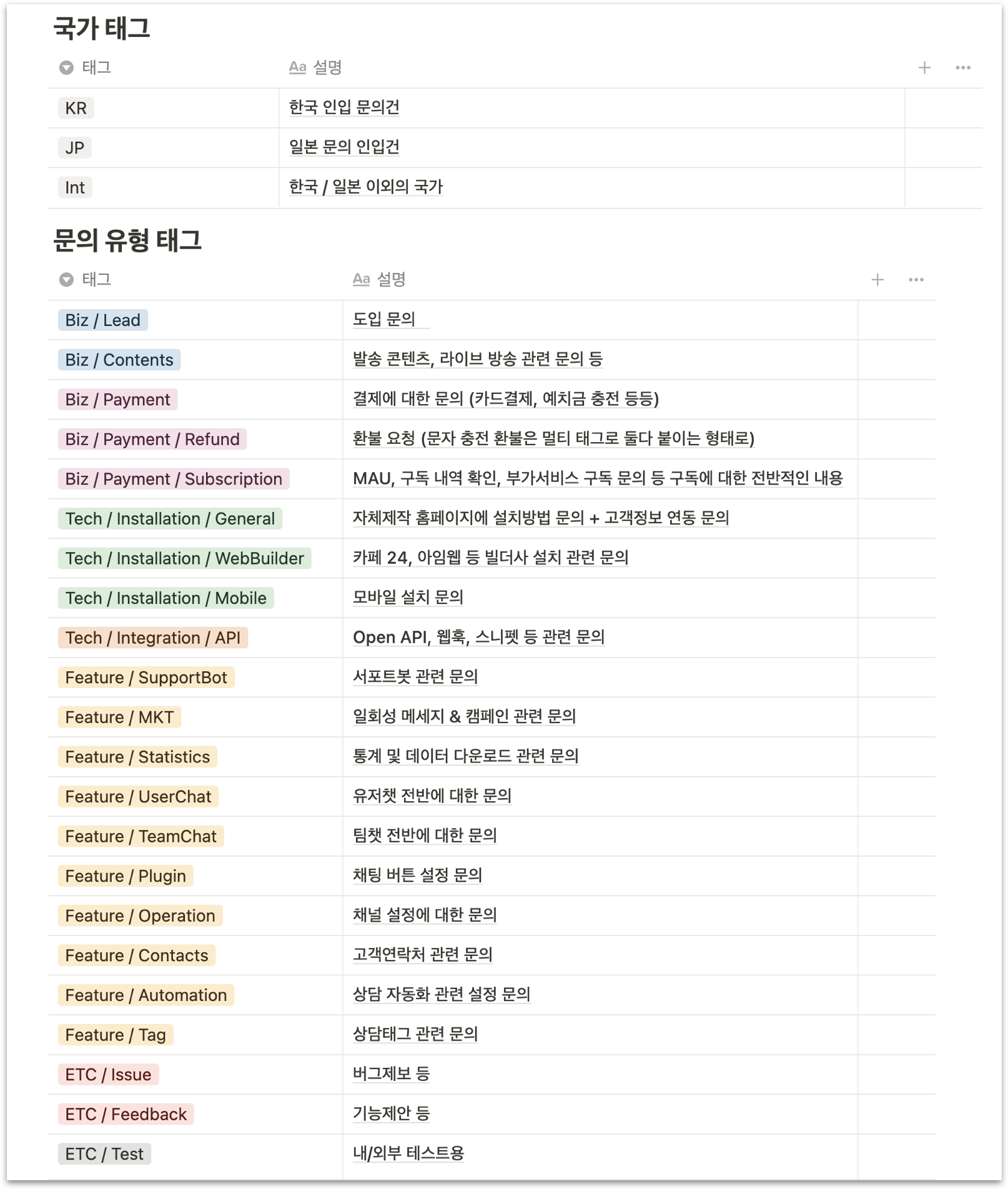 어느 국가의 문의인지 분류하는 국가별 태그를 새로 생성하였고, 기능 / 기술 / 결제 / 기타문의 의 4개의 대분류로 구분 및 하위단계를 설정하는 형태의 개편을 진행했습니다. 이 때 활용한 분류의 기준은 설정했었던 카테고리를 기반으로 했었는데요, 2단계는 기존 카테고리의 분류를 활용하였고, 그 중 많이 들어오는 문의는 3단계로 분류하여 상담 내용 관리를 진행했습니다.