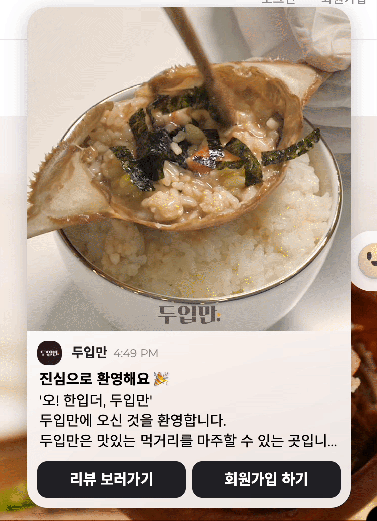 식품 커머스몰 '두입만'은 제품 영상을 메인페이지에 노출해 구매욕구를 자극하는 마케팅 메시지를 세팅했어요!