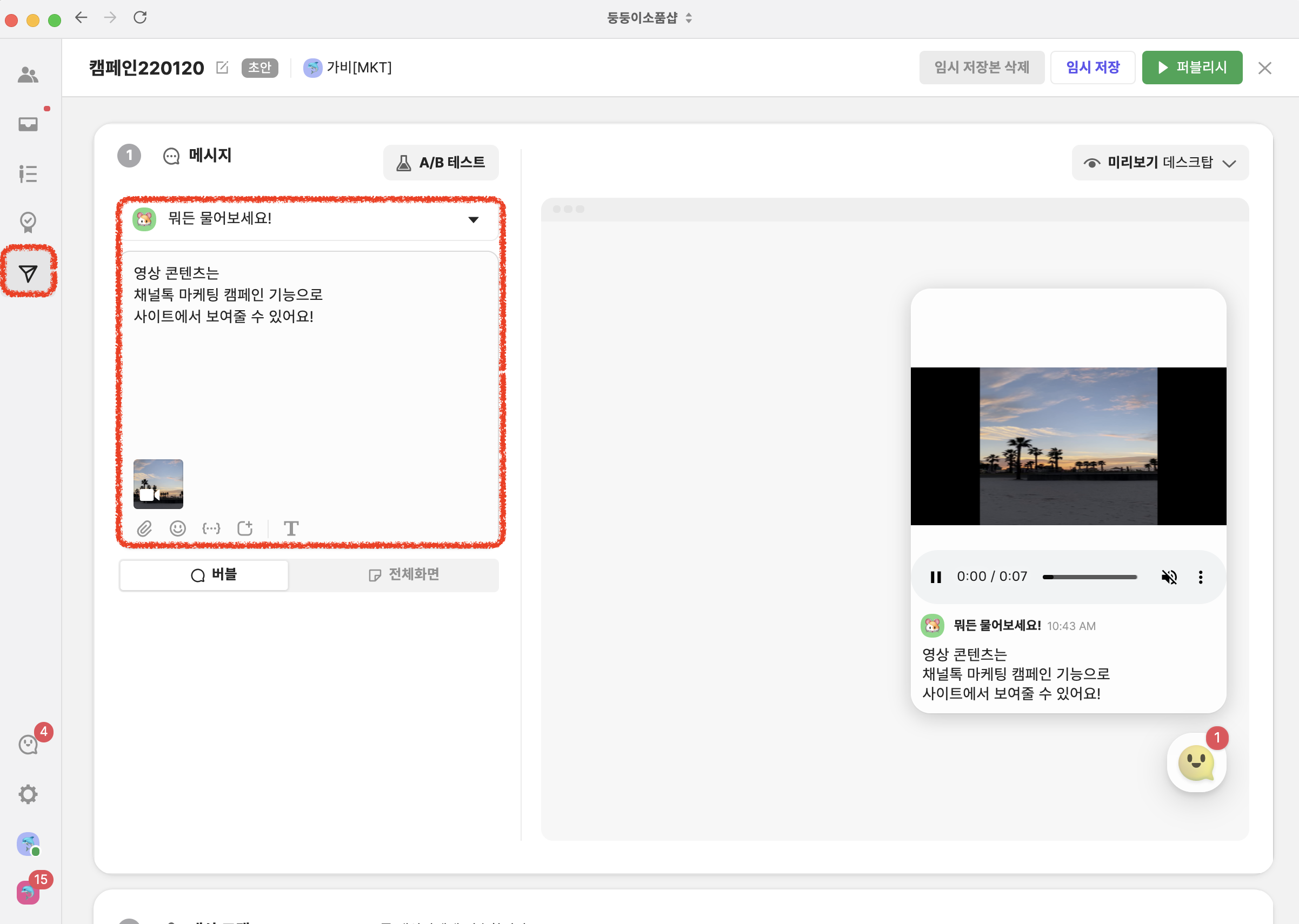 마케팅 캠페인 기능으로 영상을 포함한 메시지 세팅법