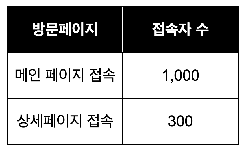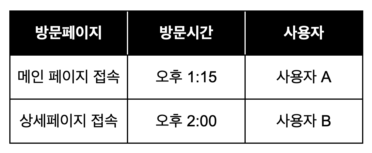위 표를 보면, 사용자A가 메인페이지에 오후 1:15에 접속했다는 것을 알 수 있죠. 위와 같은 웹로그가 1,000개 정도 쌓였다고 가정해보면 메인페이지 접속자 수와 상세페이지 접속자 수를 알 수 있게 돼요.