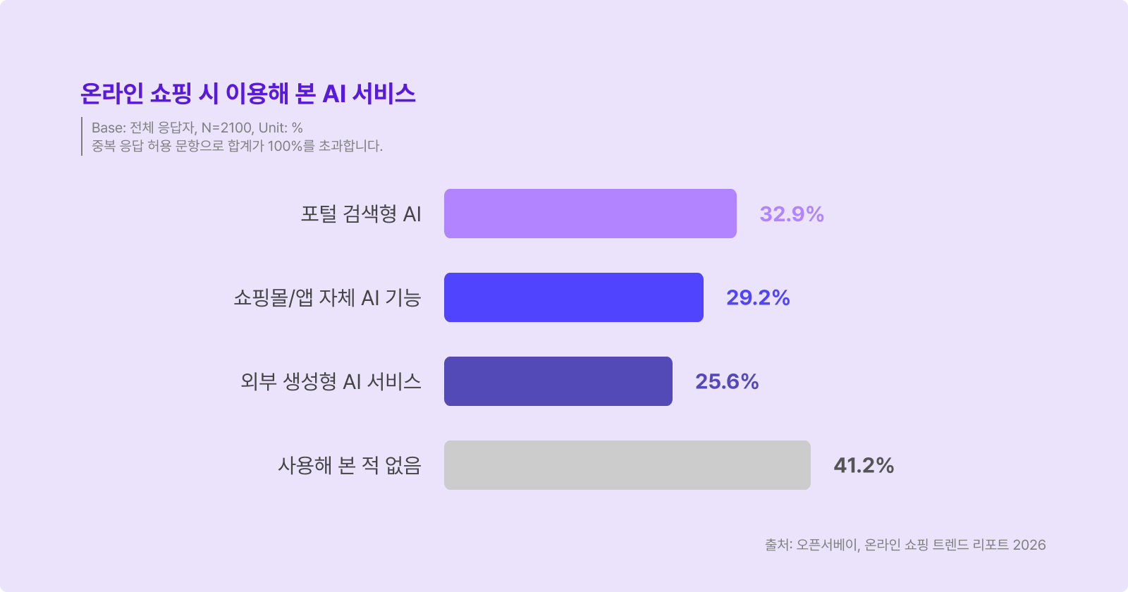 글로벌 흐름은 이미 국내 시장에서도 이어지는데요. 오픈서베이가 발표한 ‘온라인 쇼핑 트렌드 리포트 2026’에 따르면, 온라인 쇼핑 시 AI 서비스를 이용해 본 국내 소비자는 10명 중 6명에 달합니다. 특히 제품 장단점 비교(54.4%)와 쇼핑몰별 최저가 비교(46.2%) 용도로 AI를 적극 활용해, 국내 소비자의 구매 결정 과정에 AI가 깊이 자리 잡기 시작했음을 알 수 있습니다.