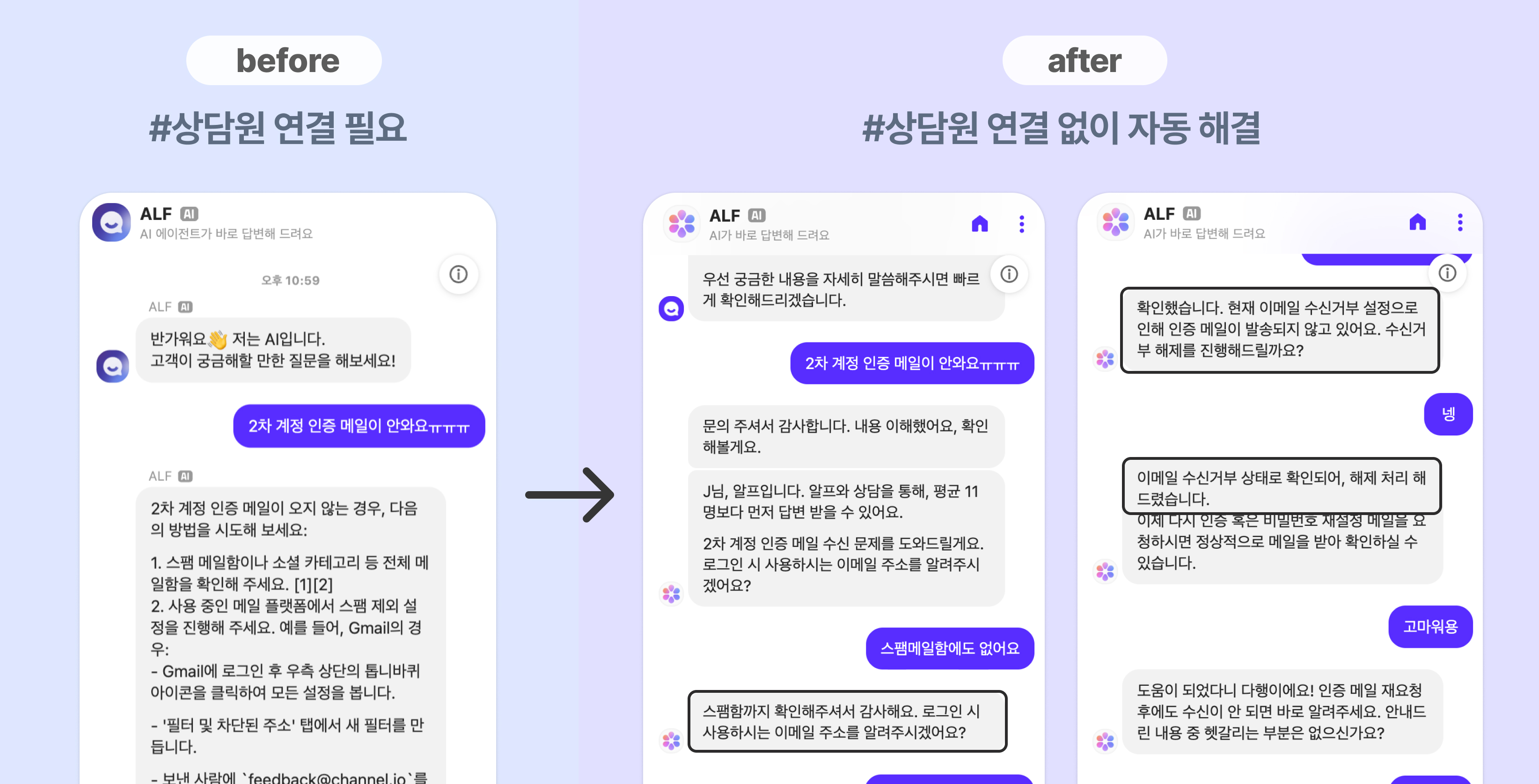 AI 에이전트는 다릅니다. 질문자의 이메일 수신 설정을 직접 확인하고, 수신거부 상태로 인해 인증 메일이 발송되지 않고 있다는 원인을 찾아내고, 수신거부 해제까지 처리합니다. 단순히 '답변'하는 게 아니라 문제를 '해결'하는 거죠.