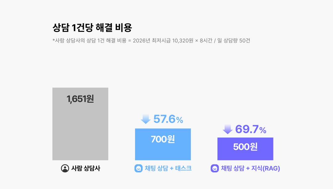 비용 차이도 명확합니다. 사람 상담사가 하루 8시간 동안 평균 50건의 문의를 처리한다고 가정하면, 상담 1건당 해결 비용은 약 1,651원이에요. 반면 AI 에이전트는 배송 조회, 교환 같은 업무를 직접 수행하더라도 건당 최소 700원, 지식 기반 답변만으로 해결할 경우 건당 500원이면 충분합니다. 최대 69.7%까지 비용이 줄어드는 거죠.