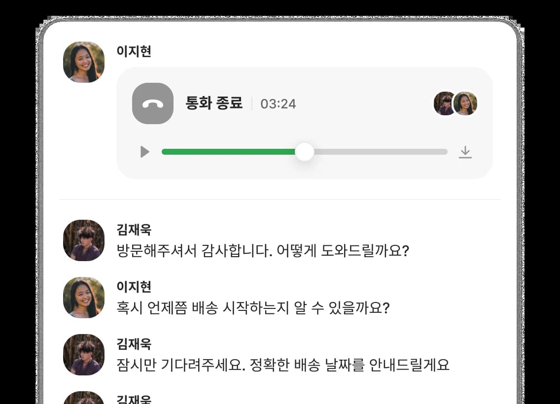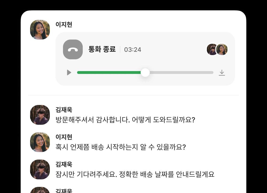 새로운 팀 멤버에게 통화 이력을 공유해 보세요. 히스토리 파악이 쉬워집니다.