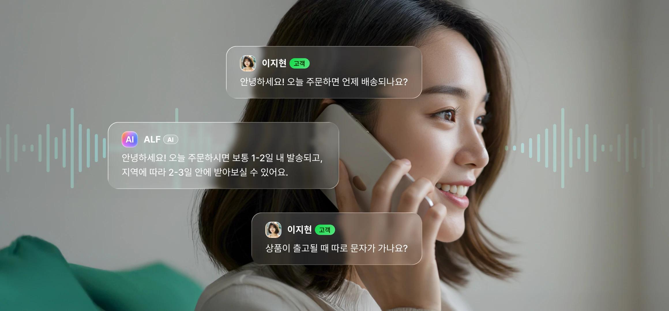 ALF와 고객의 통화는 실시간 텍스트로 확인할 수 있고, 통화 종료 후 녹음, 요약, 통계까지 제공합니다.