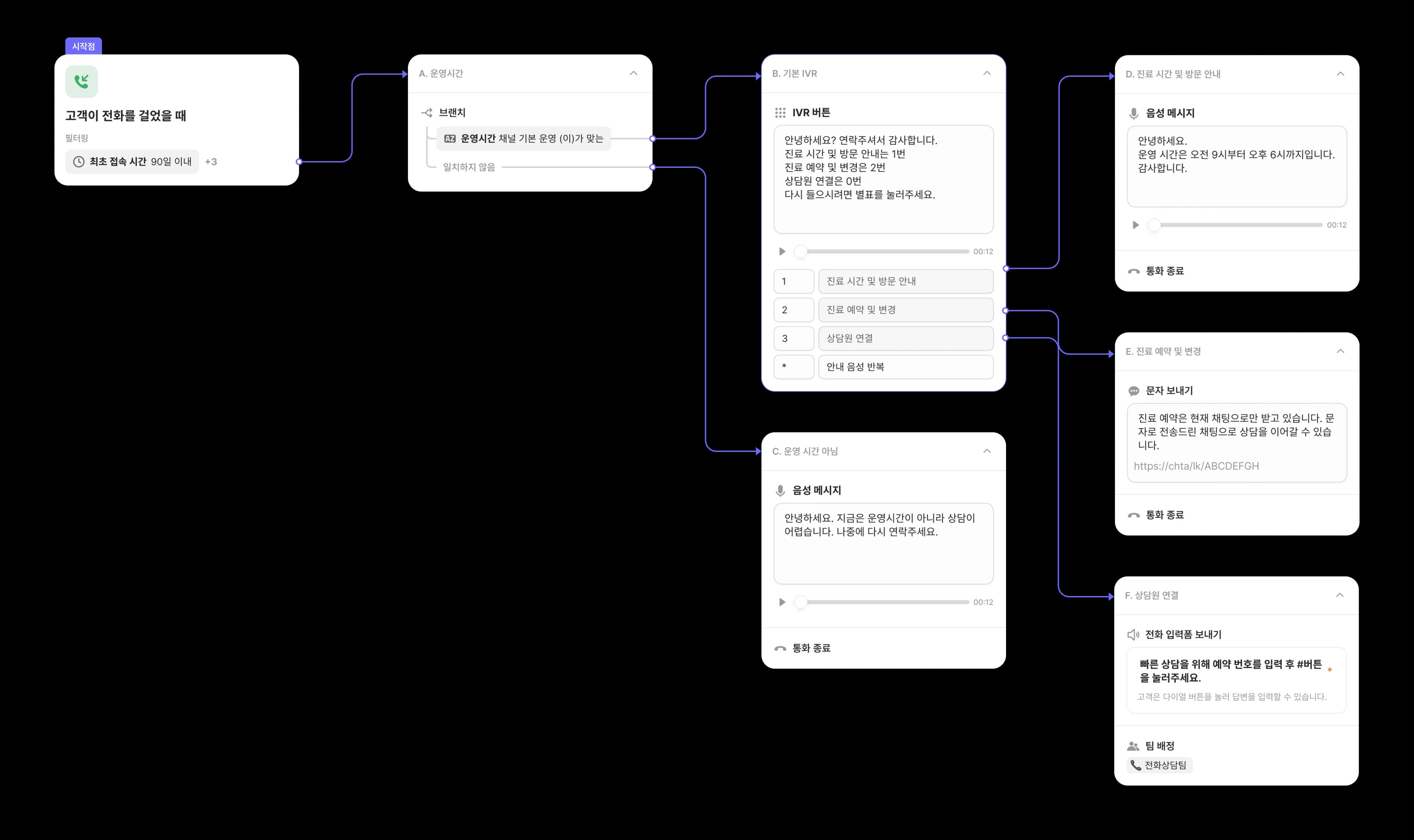 개발자 없이 상담 시나리오를 그릴 수 있어요. 시나리오는 수정하면 즉시 적용됩니다.