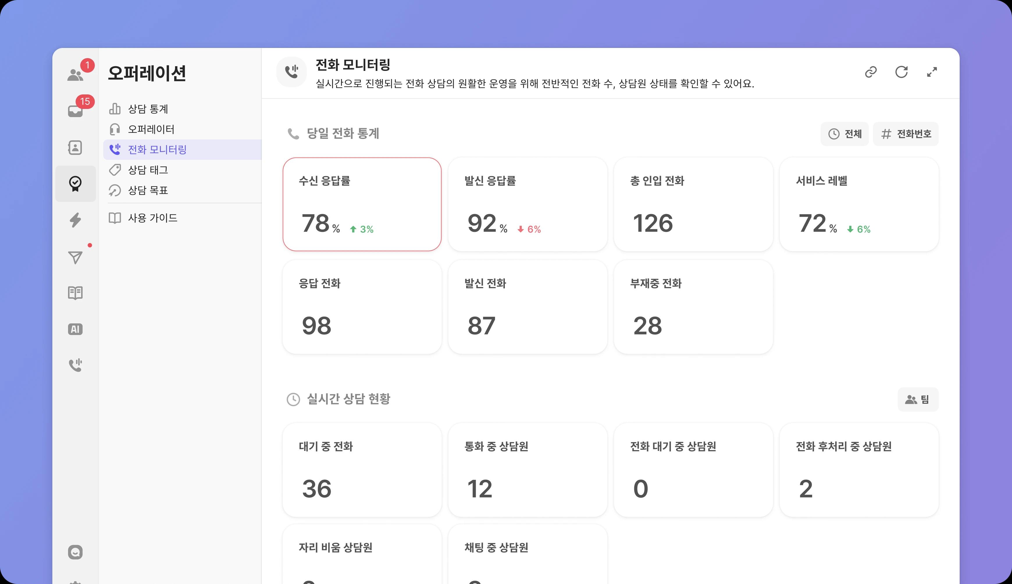 오늘의 전화 응답률, 지금 대기 중인 전화 등 전화 상담 현황이 1분마다 업데이트됩니다.