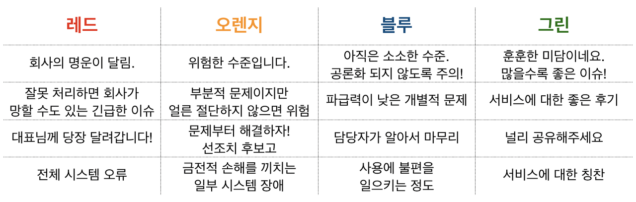 모든 이슈가 똑같이 중요하고 긴급하지는 않아요. 당장 대표까지 발 벗고 나서서 대응해야 하는 이슈가 있는가 하면, 담당자가 알아서 센스있게 처리해도 좋은 정도의 이슈도 있죠. 등급을 나누는 이유는 잘 처리하기 위함이기 때문에 긴급도와 담당자를 잘 배정해주시는 게 좋아요. 맥도날드, 네이버, 배달의 민족에서 오퍼레이션을 담당한 오퍼레이터 천세희는 '레드-오렌지-블루-그린' 등급을 만들어 이슈를 관리했다고 해요.
