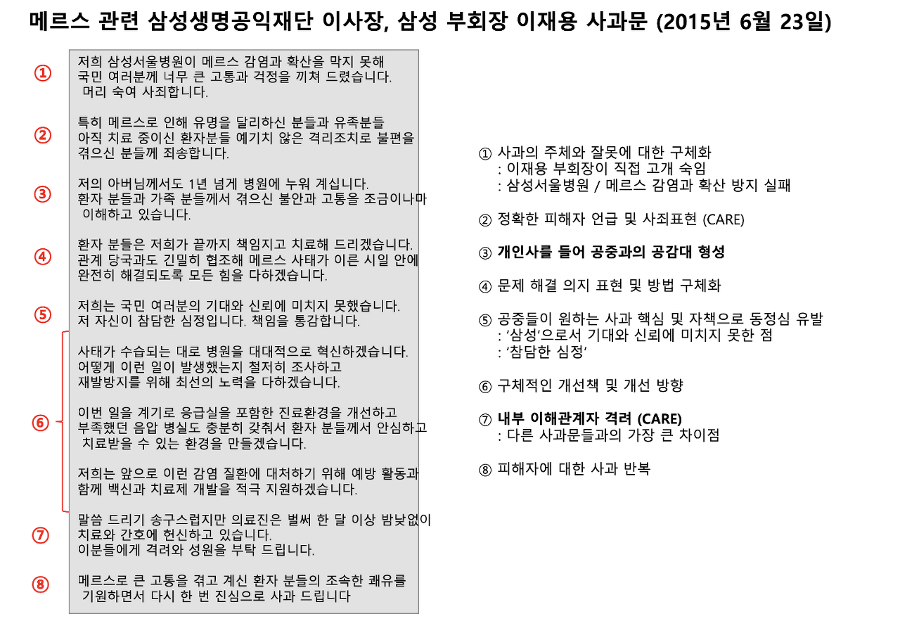 메르스 사태로 온 국민의 건강에 위협이 가해졌던 2015년, 이재용 부회장이 삼성서울병원을 대표해 직접 국민 앞에 고개 숙여 사과한 사건이 있었습니다. 이때 발표한 사과문은 좋은 사과문의 정석으로 길이길이 전해지고 있습니다.