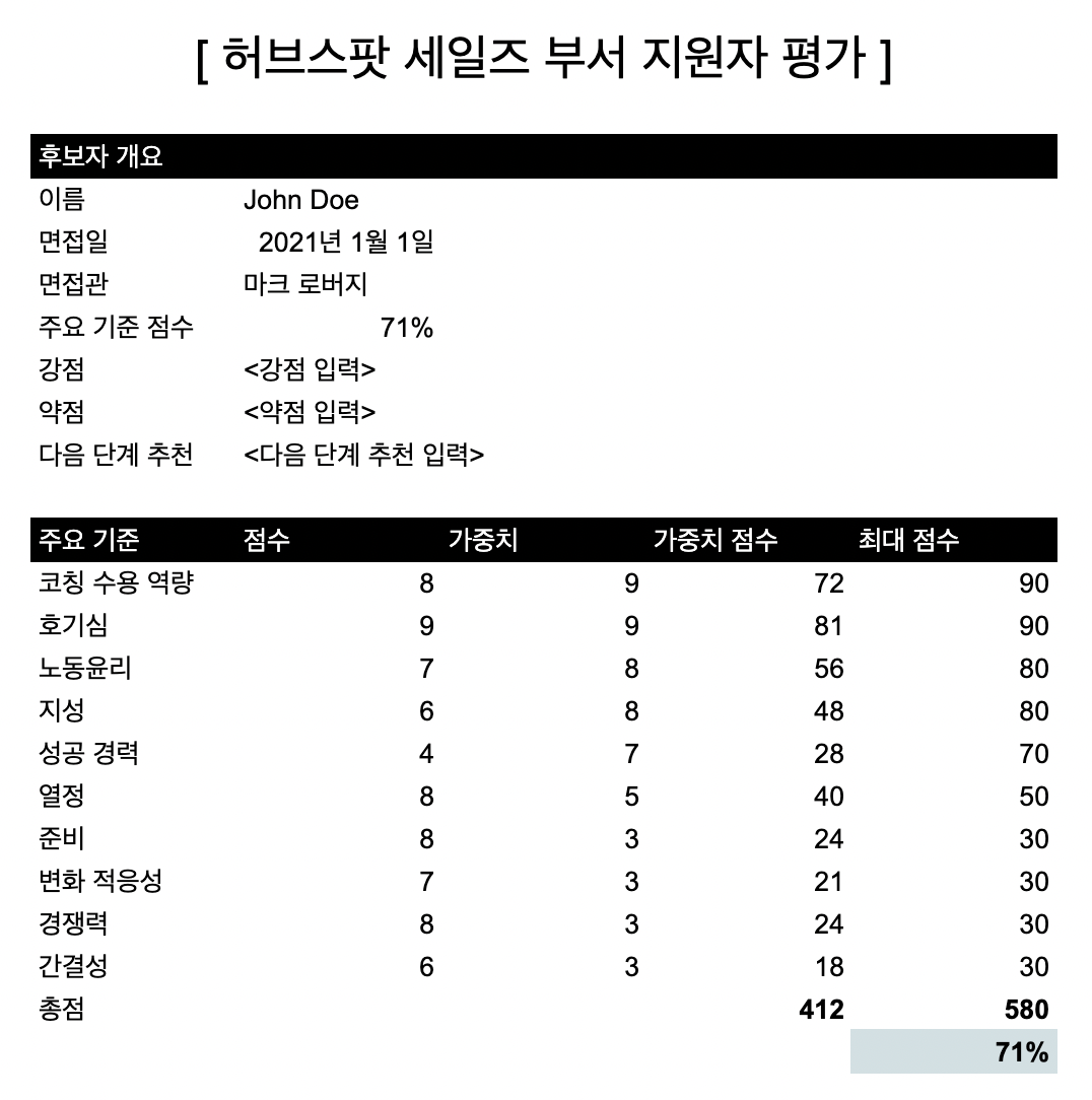 허브스팟 세일즈 부서 지원자 평가표