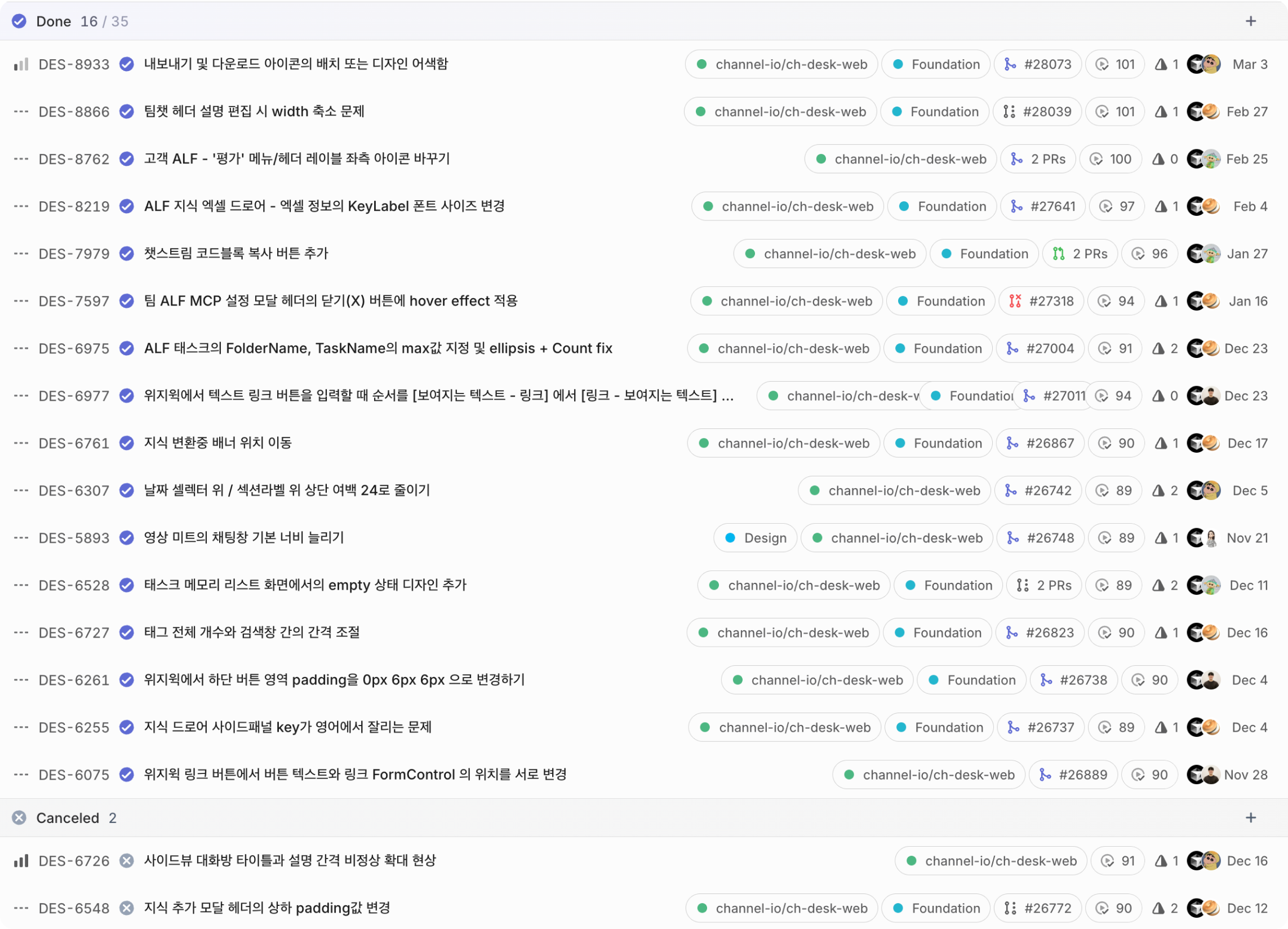 첨부한 스크린샷은 디자인 팀원들이 가드닝으로 해결한 이슈들 중 일부인데요, 큰 기능 변경 없이 순수하게 스타일과 레이아웃만 수정한 것들입니다. 아마 개발자에게 요청했다면 우선순위에 밀려 반 이상은 아직도 백로그에 잠들어 있었을 거라고 생각해요.