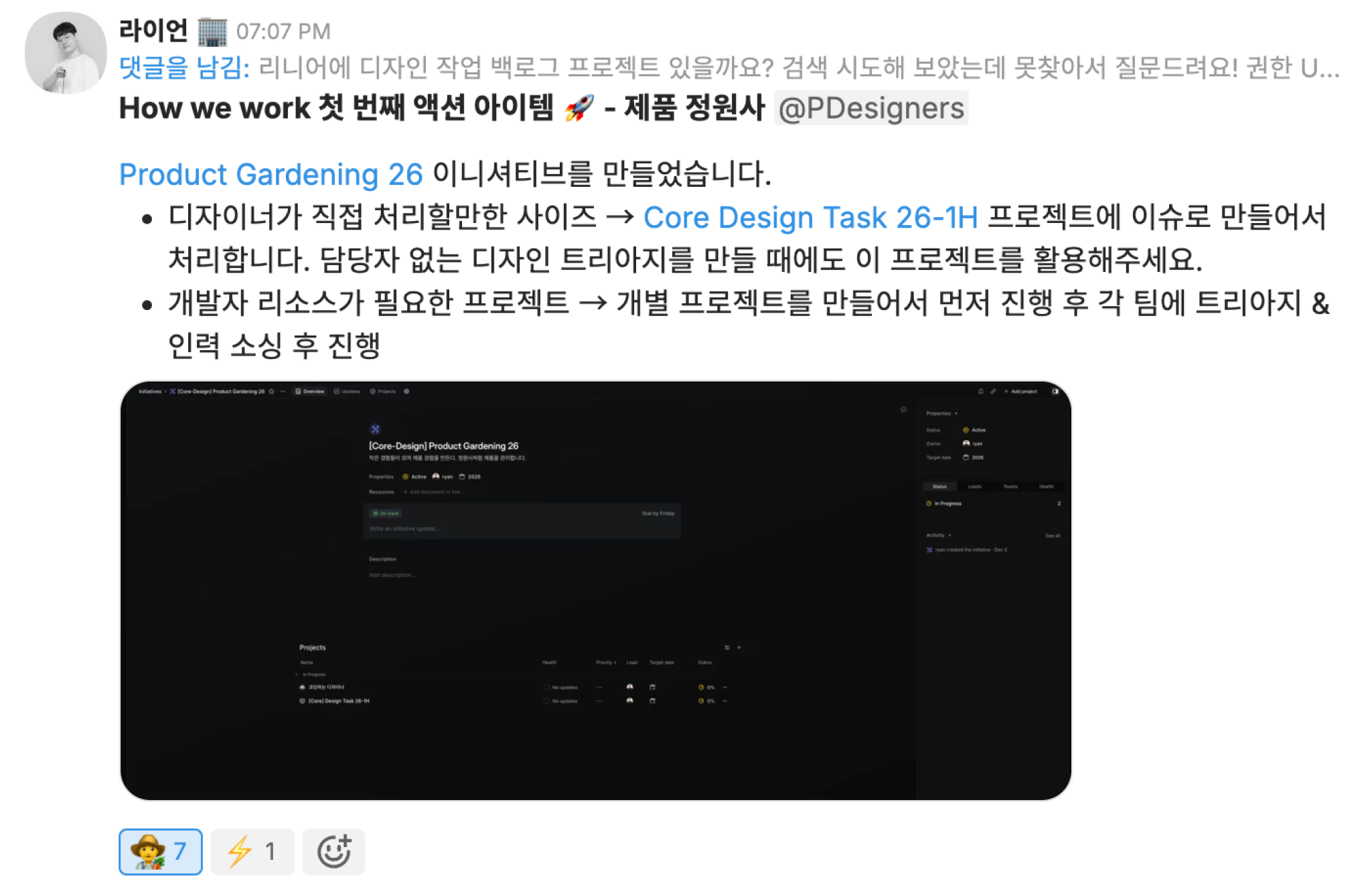 채널톡은 엔지니어 분들이 만들어주신 킬버그(Kill Bug)라는 자동화 워크플로우 도구를 사용하고 있습니다. 제품 피드백이나 버그 제보가 들어오면, 팀 채팅 스레드에 킬버그를 소환하면 돼요. 그러면 이슈 관리 툴인 Linear에 티켓이 자동 등록됩니다. 이슈가 흩어지지 않고 한 곳에 모이는 게 핵심이에요.