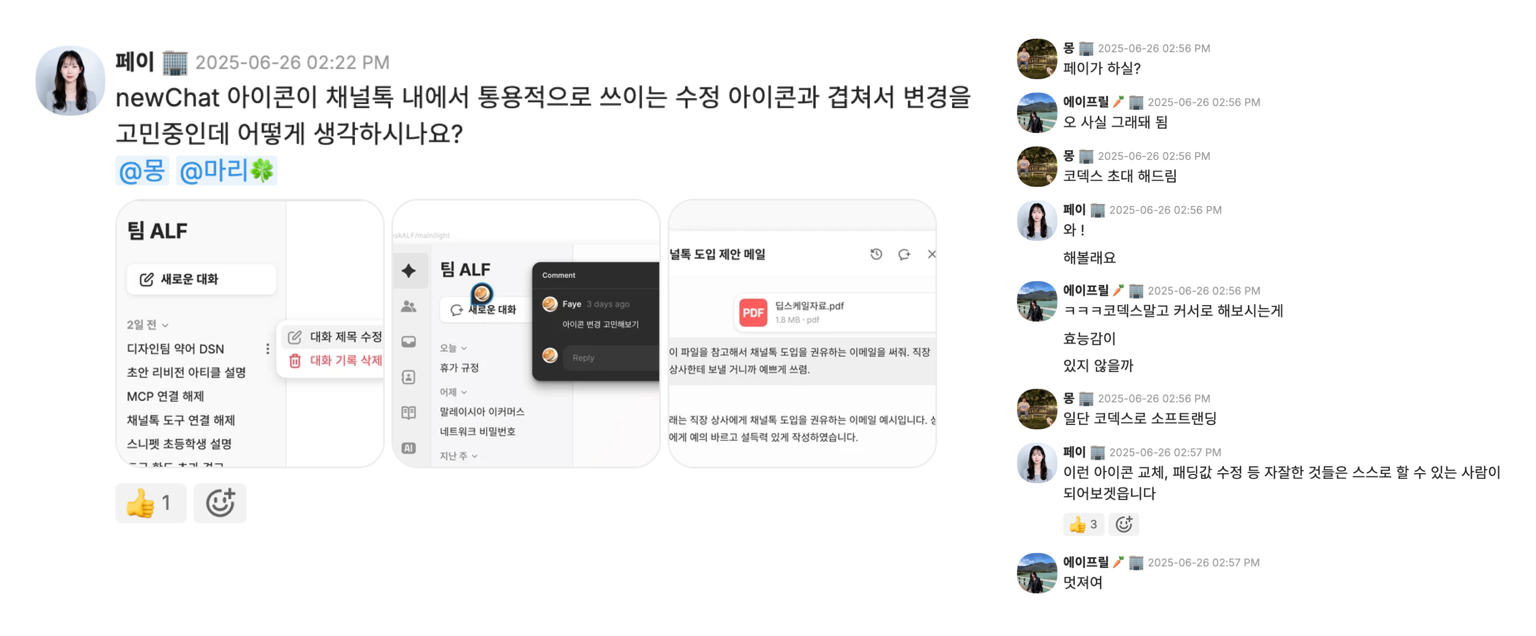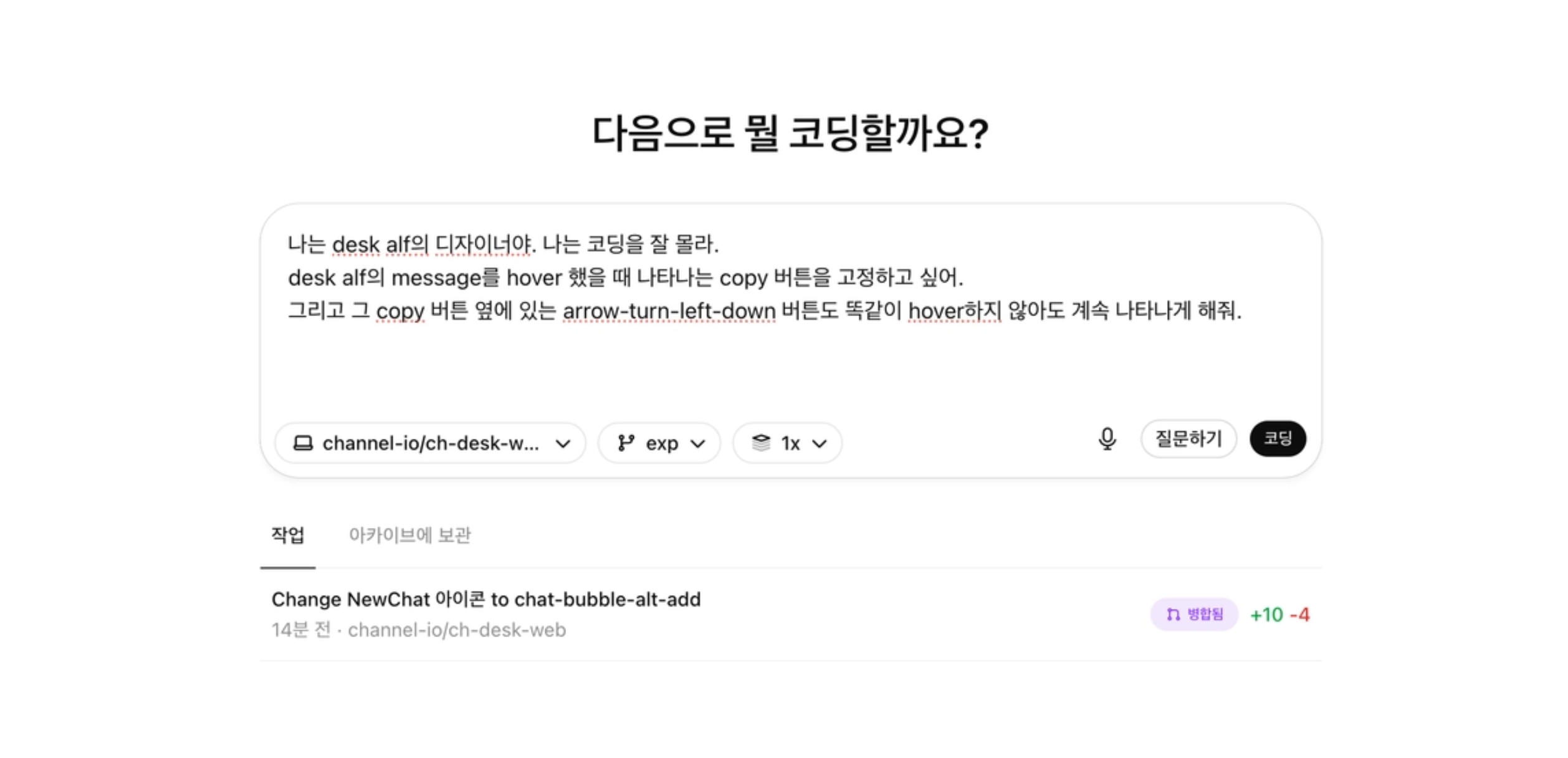 당시 채널톡의 사내용 AI인 팀 ALF를 만들고 있던 저는 수정 아이콘 하나를 바꾸고 싶었는데, 함께 일하는 스쿼드의 개발자들이 너무 바쁜 상황이었어요. 마침 개발자들이 Codex를 써보고 있던 참이었는데, 개발 리드가 저한테 직접 아이콘을 수정해보라며 Codex에 초대해 주셨어요.