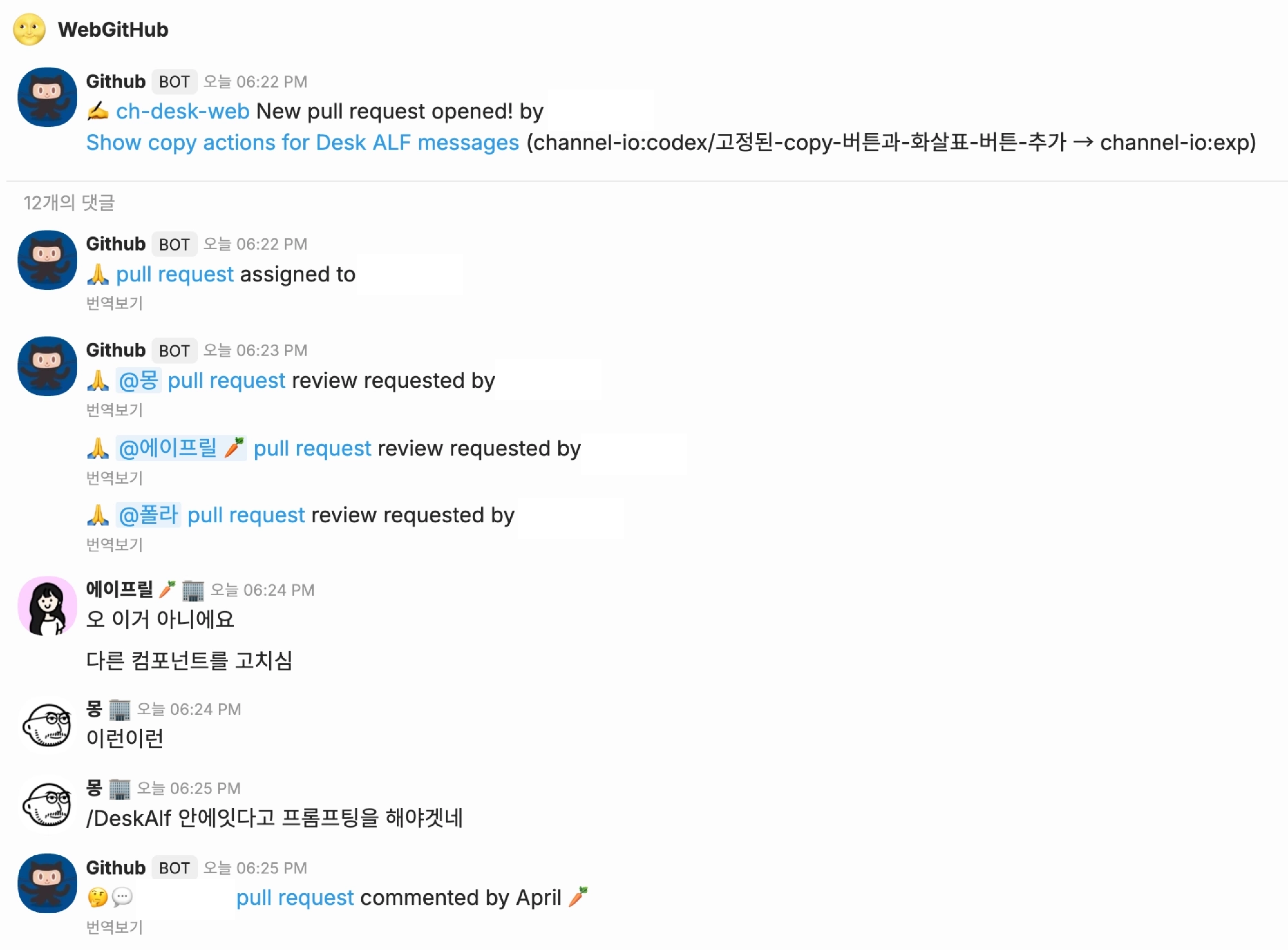 처음으로 Codex가 뱉어낸 PR은 대참사. 프론트 개발자분의 꼼꼼한 리뷰 아니었으면 큰일 날 뻔 했습니다. (팀 ALF의 메시지 스트림을 수정해야 하는데, 채널톡 데스크의 전체 메시지 스트림을 건들인 거예요.) 지금은 웃으며 쓰지만(?) 당시엔 정말 등줄기가 오싹했답니다.