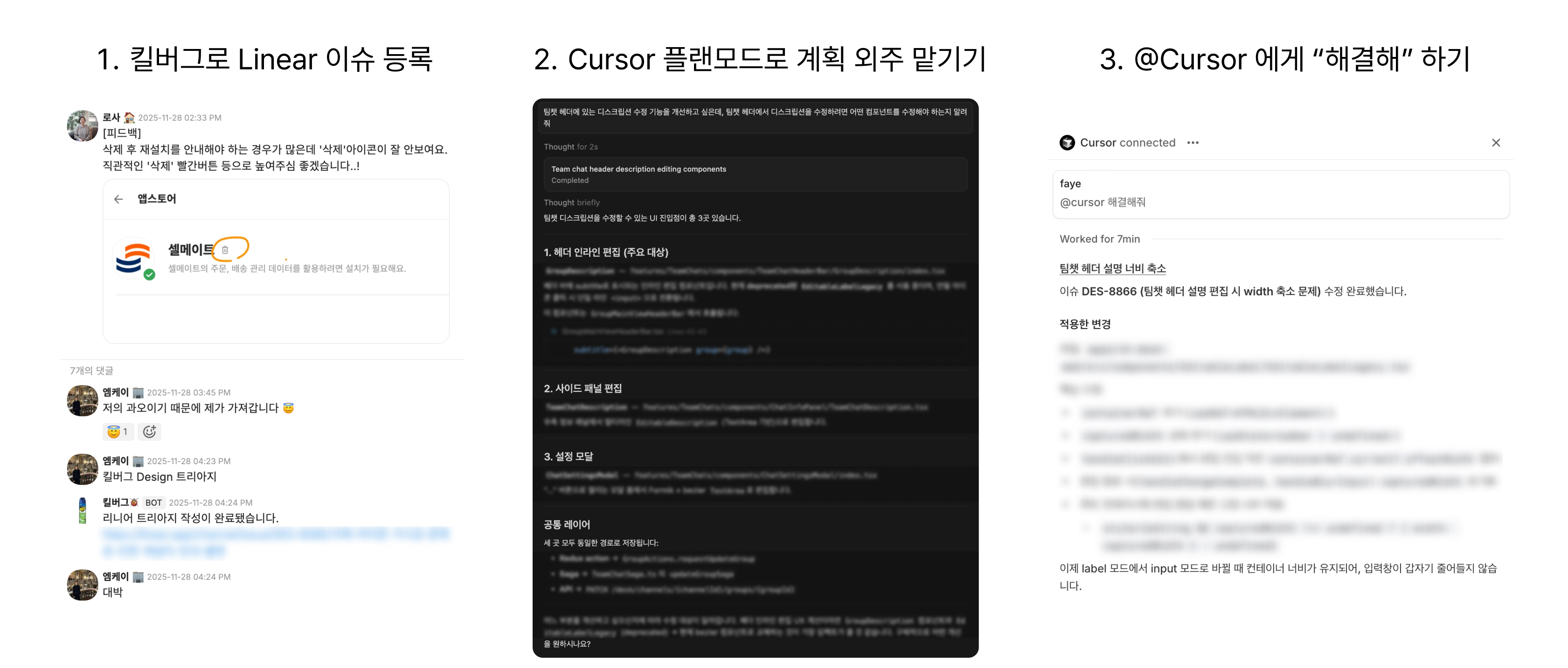 Linear 티켓에는 현재 상태 스크린샷, 기대 스펙 (디자인 명세), 재현 조건 (특정 해상도에서만 발생하는지, 특정 데이터일 때만 발생하는지 등)을 꼼꼼히 적어둡니다. 나중에 Cursor Agent에게 전달할 컨텍스트가 되거든요.