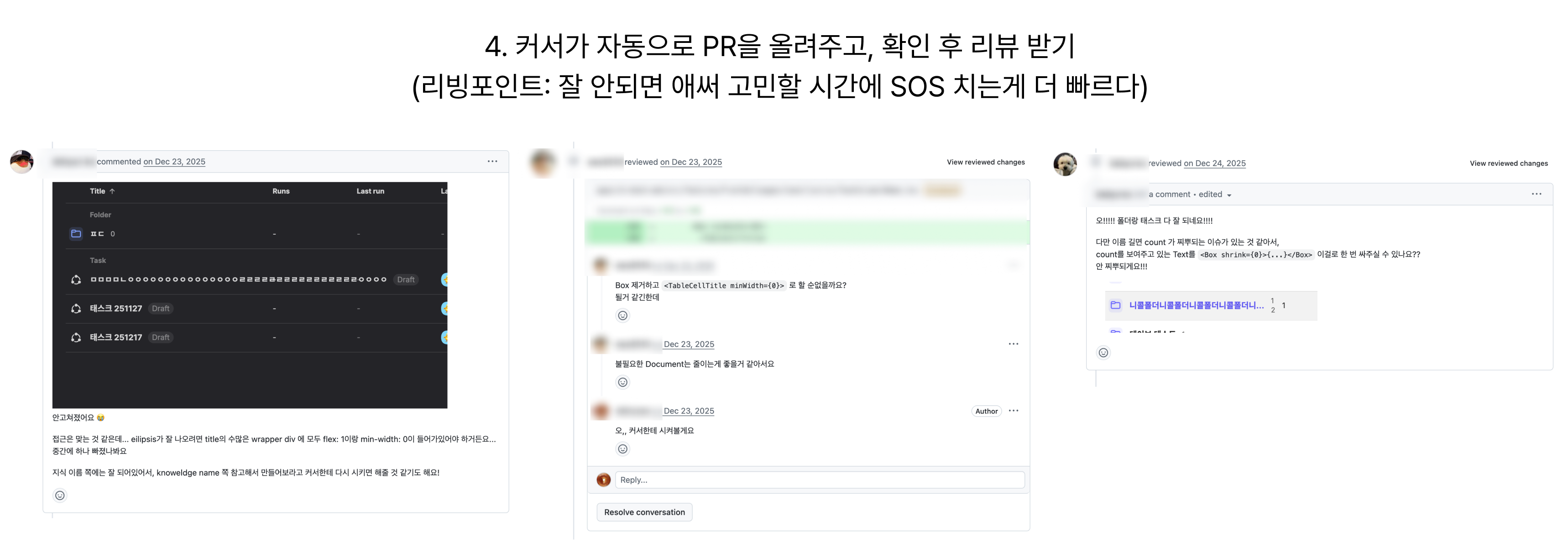 한 번에 잘 안 되거나 구조가 까다롭다면, 개발자분들이 달려와서 코멘트를 달아주십니다. 그리고 알려주신 방법대로 다시 Cursor에게 시켜요. 이렇게 리뷰를 받아 PR이 머지되면 Linear 티켓이 자동으로 Done 처리되고, 오랫동안 쌓여 있던 백로그가 하나씩 사라집니다.